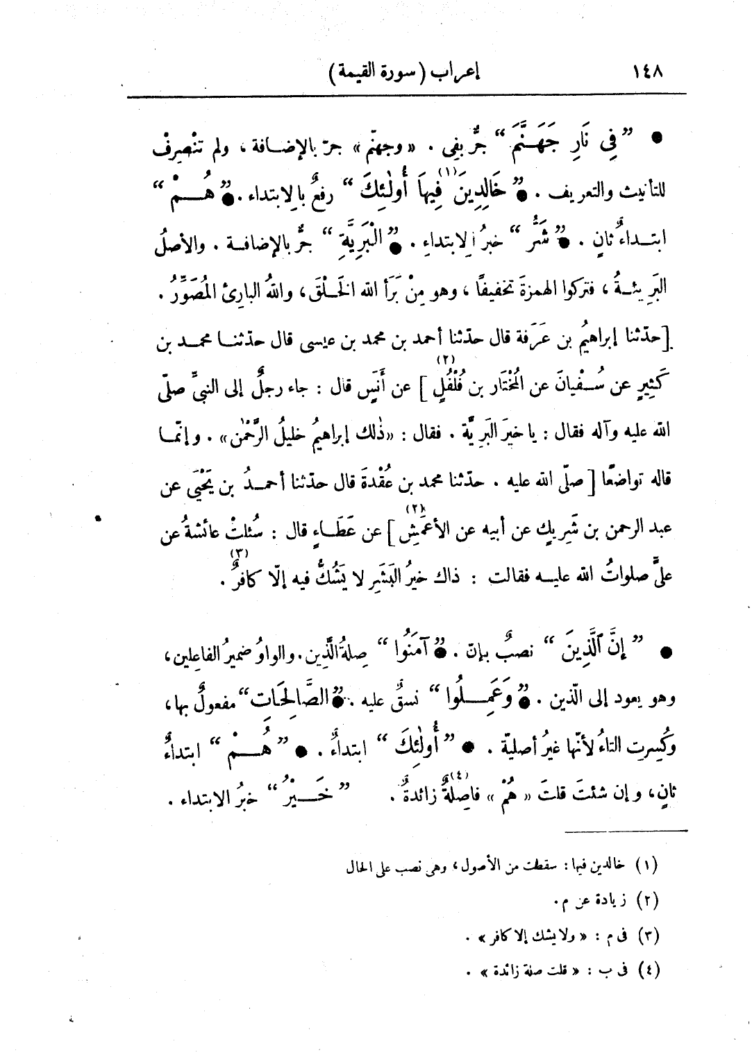 • "إن الذين" نصب بإن. "آمنوا" صة الذين. والواو ضمير الفاعلين، وهو يعود إلى الذين. "وعلموا" نسق عليه. "الصالحات" مفعول بها، وكسرت التاء لأنها غير أصلية. •"أولئك" ابتداء. "هم" ابتداءٌ ثان، وإن شئت قلت «هم» فاصلة زائدة. "خير" خبر الابتداء.