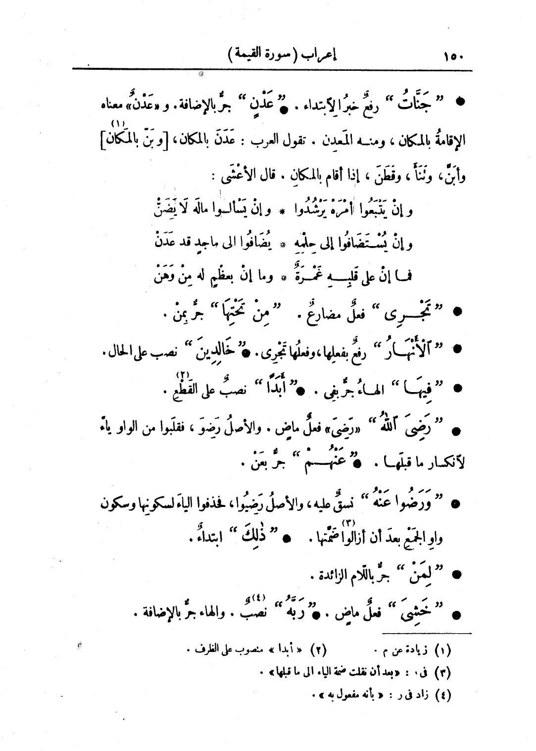 • "جنات" رفع خبر الابتداء. "عدن" جر بالإضافة، و «عدن» معناه الإقامة بالمكان، ومنه المعدن. تقول العرب: عدن بالمكان، [وبن بالمكان] وأبن، وتنأ، وقطن إذا أقام بالمكان. قال الأعشى: