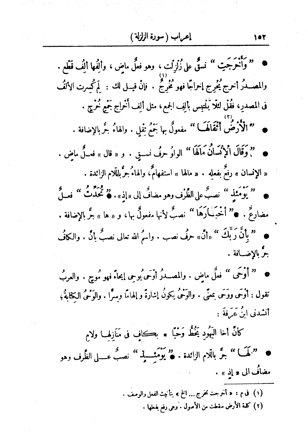 • "يومئذ" نصب على الظرف وهو مضاف إلى «إذ». "تحدث" فعل مضارع. "أخبارها" نصب لأنها مفعول بها، و «ها» جر بالإضافة.