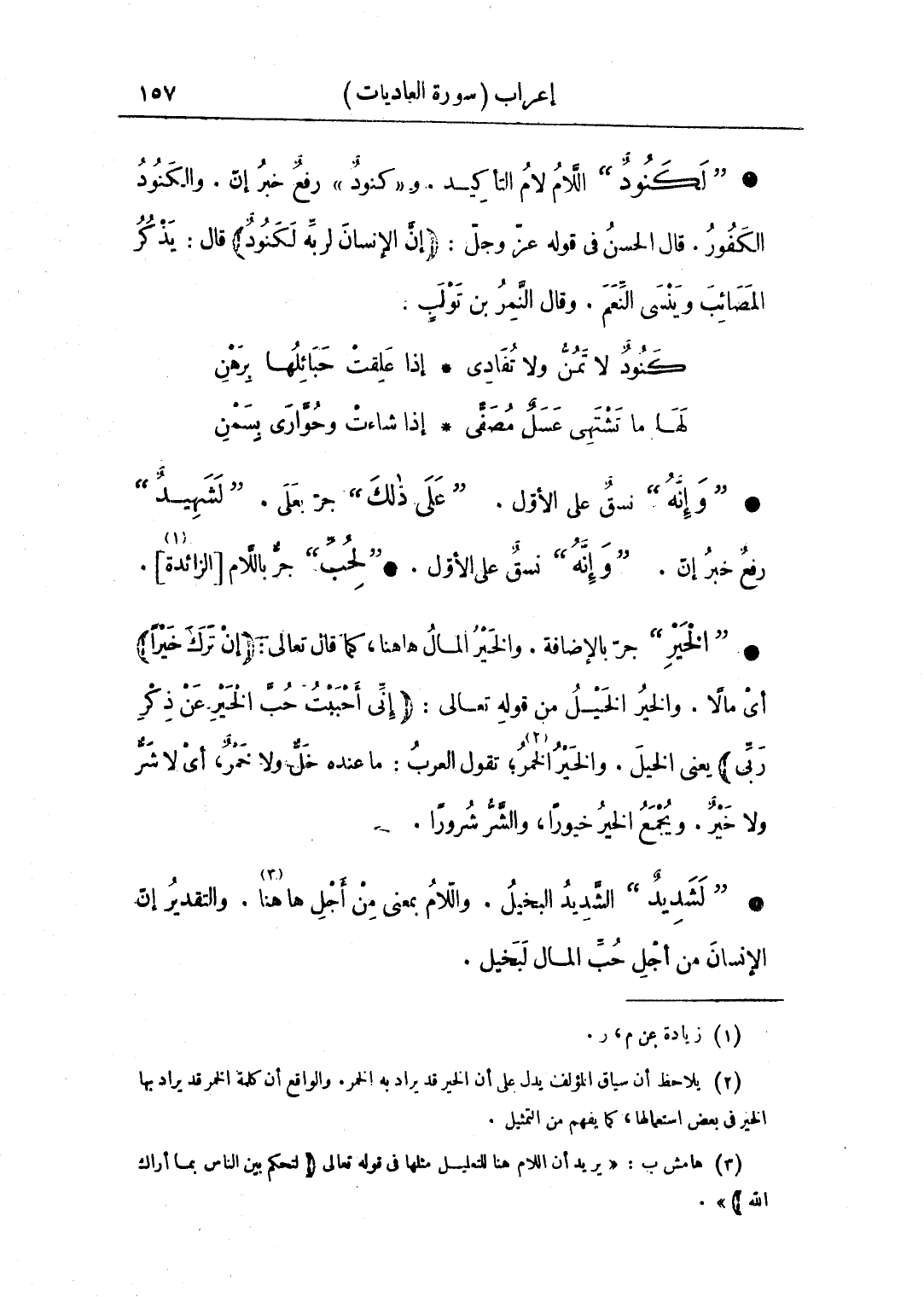 • "لكنود" اللام لام التأكيد. و"كنود" رفع خبر إن. والكنود الكفور. قال الحسن في قوله عز وجل: (إن الإنسان لربه لكنود) قال: يذكر المصائب وينسى النعم، وقال النمر بن تولب: