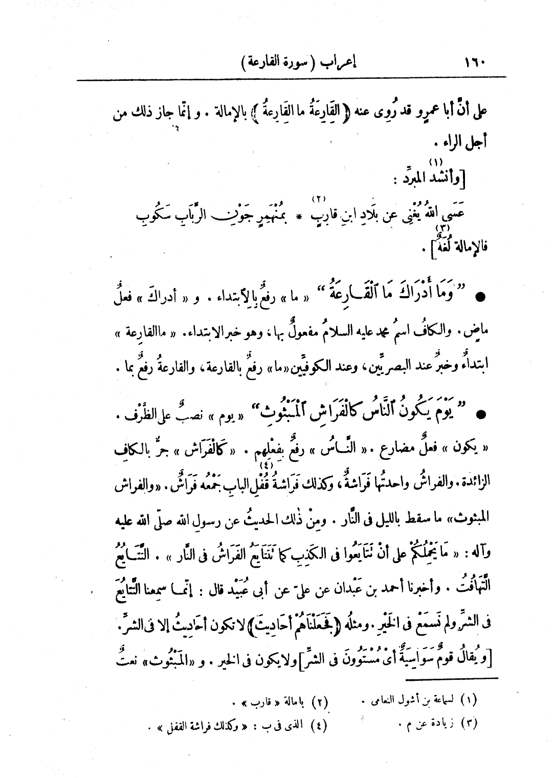 • "يوم يكون الناس كالفراش المبثوث" «يوم» نصب على الظرف. "يكون" فعل مضارع. «الناس» رفع بفعلهم. «كالفراش» جر بالكاف الزائدة. والفراش واحدتها فراشة، وكذلك فراشة قفل الباب جمعه فراش. «والفراش المبثوث» ما سقط بالليل في النار. ومن ذلك الحديث عن رسول الله صلى الله عليه وآله: «ما يحملكم على أن تتايعوا في الكذب كما تتتايع الفراش في النار». التتايع التهافت. وأخبرنا أحمد بن عبدان عن علي عن أبي عبيد قال: إنما سمعنا التتايع في الشر ولم نسمع في الخير. ومثله (فجعلناهم أحاديث): لا تكون أحاديث إلا في الشر. [ويقال قوم سواسية أي مستوون في الشر] ولا يكون في الخير. و «المبثوث» نعتٌ