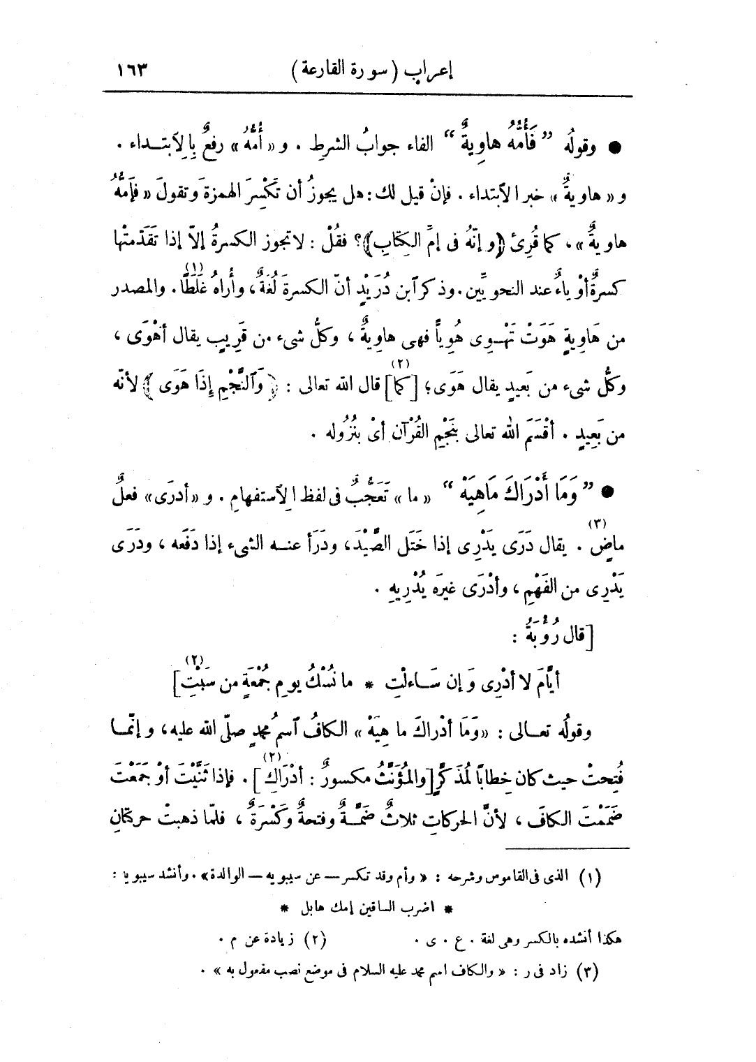 • وقوله "فأمه هاوية" الفاء جواب الشرط. و «أمه» رفع بالابتداء. و «هاوية» خبر الابتداء. فإن قيل لك: هل يجوز أن تكسر الهمزة وتقول «فإمه هاوية» كما قرئ (وإنه في إم الكتاب)؟ فقل: لا تجوز الكسرة إلا إذا تقدمتها كسرة أو ياءٌ عند النحويين. وذكر ابن دريد أن الكسرة لغة، وأراه غلطًا. والمصدر من هاوية هوت تهوي هويا فهي هاوية، وكل شيء من قريب يقال أهوى، وكل شيء من بعيد يقال هَوى، [كما] قال الله تعالى (والنجم إذا هوى): لأنه من بعيد. أقسم الله تعالى بنجم القرآن أي بنزوله.