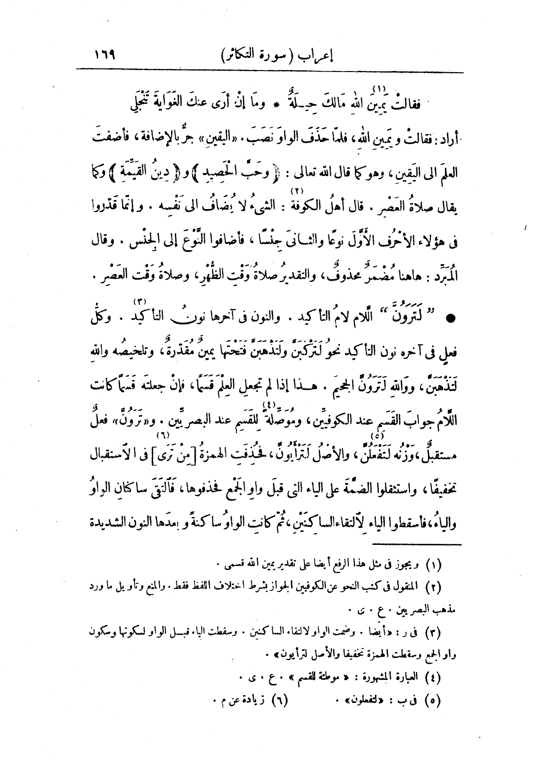 • "لترون" اللام لام التأكيد. والنون في آخرها نون التأكيد. وكل فعل في آخره نون التأكيد نحو لتركبن ولتذهبن فتحتها يمين مقدرة، وتلخيصه والله لتذهبن، والله لترون الجحيم. هذا إذا لم تجعل العلم قسما، فإن جعلته قسما كانت اللام جواب القسم عند الكوفيين، وموصلة للقسم عند البصريين. و «ترون» فعل مستقبل، وزنه لتفعلن، والأصل لترأيون، فحذفت الهمزة [من ترى] في الاستقبال تخفيفا، واستثقلوا الضمة على الياء التي قبل واو الجمع فحذفوها، فالتقى ساكنان الواو والياء، فأسقطوا الياء لالتقاء الساكنين، ثم كانت الواو ساكنة وبعدها النون الشديدة
