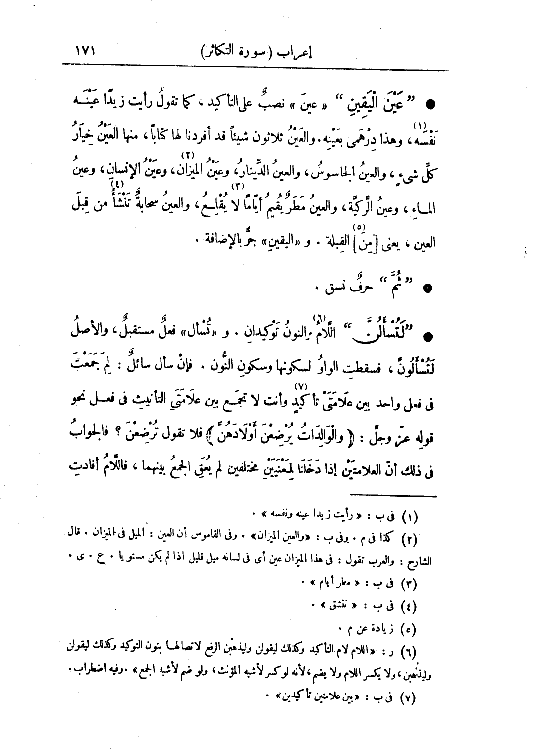 • "عين اليقين" «عين» نصب على التأكيد، كما تقول رأيت زيدًا عينه، نفسه، وهذا درهمي بعينه. والعين ثلاثون شيئًا قد أفردنا لها كتابًا، منها العين خيار كل شيء، والعين الجاسوس، والعين الدينار، وعين الميزان، وعين الإنسان، وعينُ الماء، وعين الركية، والعين مطر يقيم أيامًا لا يقلع، والعين سحابة تنشأ من قبل العين، يعني [من] القبلة. «اليقين» جر بالإضافة.