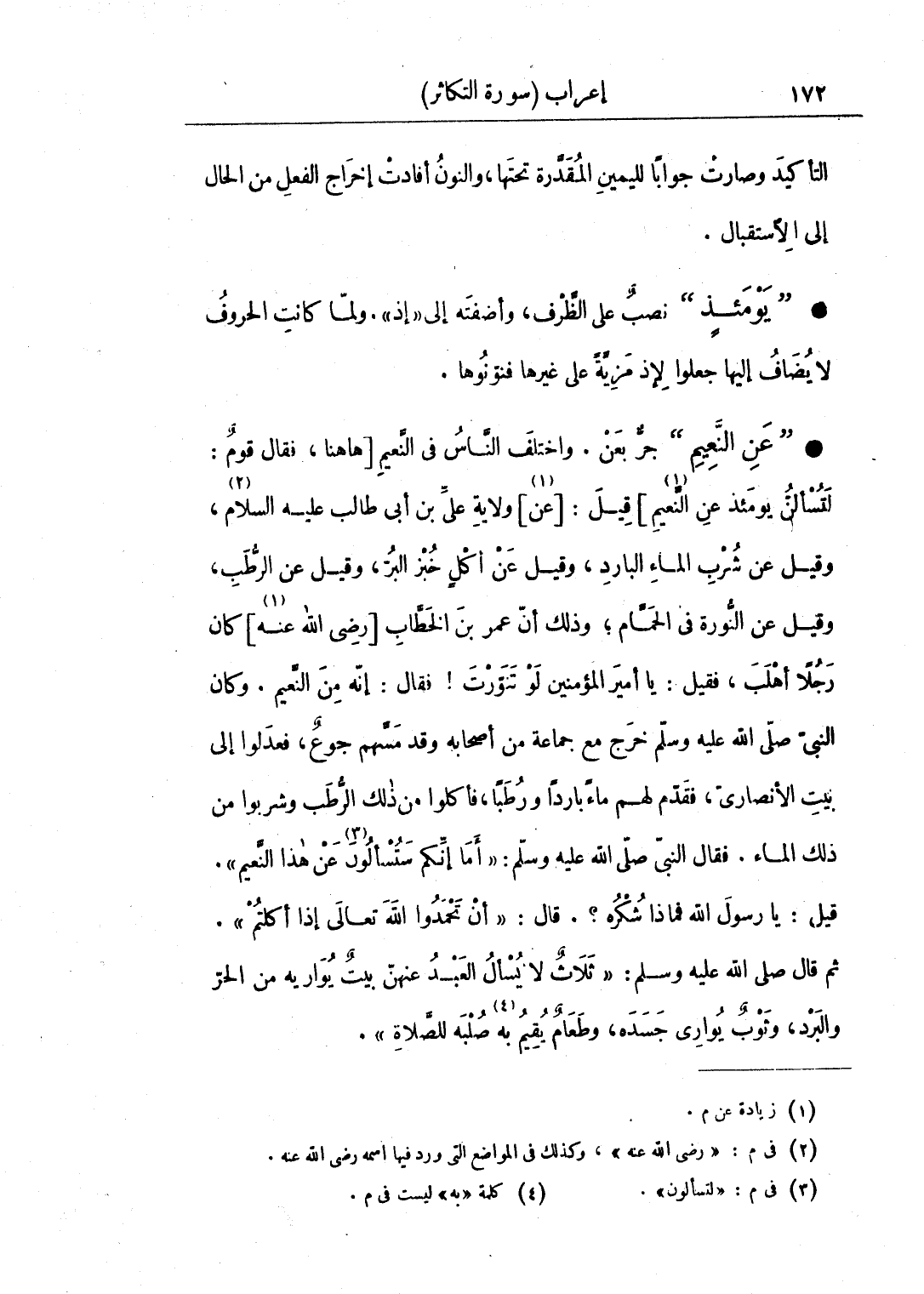 • "عين النعيم" جر بعن، واختلف الناس في النعيم [ها هنا، فقال قوم: لتسألن يومئذ عن النعيم] قيل: [عن] ولاية علي بن أبي طالب عليه السلام، وقيل: عن شرب الماء البارد، وقيل عن أكل خبز البر، وقيل عن الرطب، وقيل عن النورة في الحمام؛ وذلك أن عمر بن الخطاب [رضي الله عنه] كان رجلا أهلب، فقيل: يا أمير المؤمنين لو تنورت، فقال إنه من النعيم. وكان النبي صلى الله عليه وسلم خرج مع جماعة من أصحابه وقد مسهم جوعٌ، فعدلوا إلى بيت الأنصاري، فقدم لهم ماءً باردًا ورطبًا، فأكلوا من ذلك الرطب وشربوا من ذلك الماء. فقال النبي صلى الله عليه وسلم: «أما إنكم ستسألون عن هذا النعيم». قيل: يارسول الله فماذا شكره؟ قال: «أن تحمدو االله تعالى إذا أكلتم». ثم قال صلى الله عليه وسلم: «ثلاث لا يسأل العبد عنهن بيت يواريه من الحر والبرد، وثوب يواري جسده، وطعام يقيم به صلبه للصلاة».