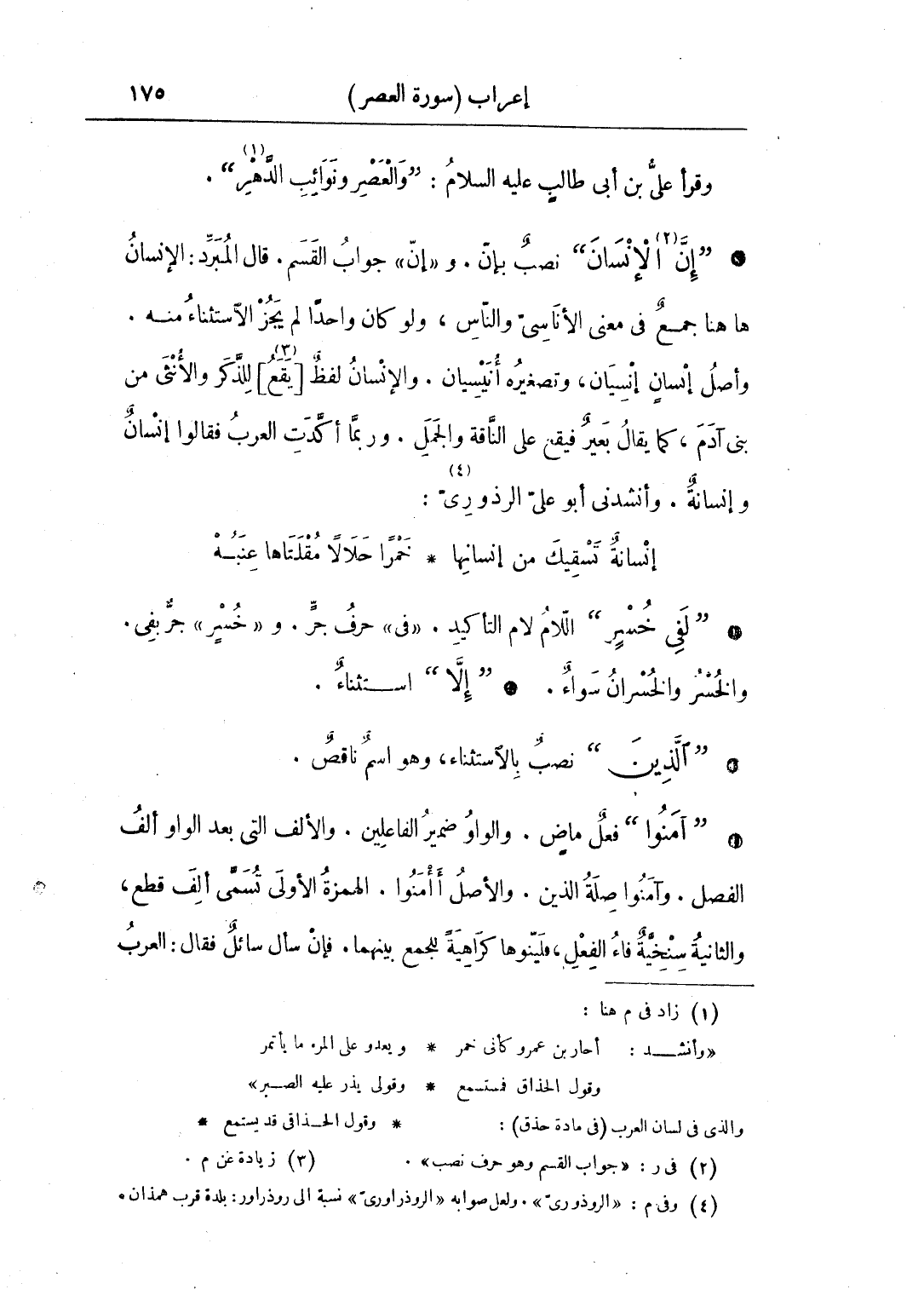 • "إن الإنسان" نصب بإن. و «إن» جواب القسم. قال المبرد: الإنسان ها هنا جمع في معنى الأناسي والناس، ولو كان واحدا لم يجز الاستثناء منه. وأصل إنسان إنسيان، وتصغيره أنيسيان. والإنسان لفظ [يقع] للذكر والأنثى من بني آدم، كما يقال بعير فيقع على الناقة والجمل. وربما أكدت العرب فقالوا إنسانٌ إنسانةٌ. وأنشدني أبو علي الرذوري: