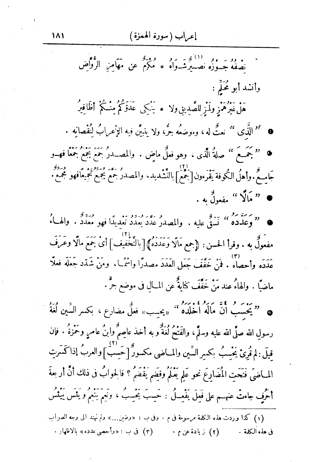 • "يحسب أن ماله أخلده" «يحسب»، فعل مضارع، بكسر السين، لغة رسول الله صلى الله عليه وسلم، والفتح لغة وبه أخد عاصمٌ وابن عامرٍ وحمزةُ. فإن قيل: لما قرئ يحسب بكسر السين والماضي مكسور [حسِبَ] والعرب إذا كسرت الماضي فتحت المضارع نحو علم يعلم وقضم يقضم؟ فالجواب في ذلك أن أربعة أحرف جاءت عنهم على فعل يفعل: حسب يحسب، ونعم ينعم، ويئس ييئس،