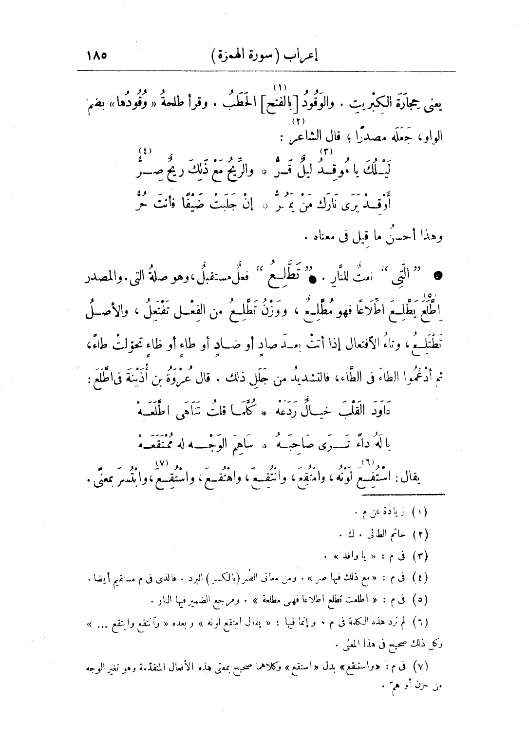 • "التي" نعت للنار. "تطلع" فعل مستقبل، وهو صلة التي. والمصدر اطلع يطلع اطلاعا فهو مطلع، ووزن تطلع من الفعل تفتعل، والأصل تطتلع، وتاء الافتعال إذا أتت بعد صاد أو ضاد أو طاء أو ظاء تحولت طاءً، ثم أدغموا الطاء في الطاء، فالتشديد من جلل ذلك، قال عروة بن أذينة في اطلع:
