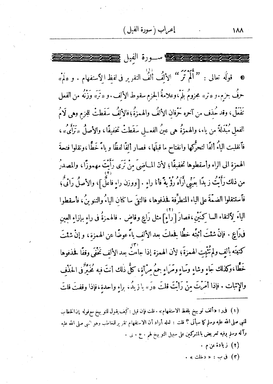 • قوله تعالى: "ألم تر" الألف ألف التقرير في لفظ الاستفهام. و «لم» حرف جزم. و «تر» مجزوم بلم، وعلامة الجزم، سقوط الألف. و «تر» ووزنه من الفعل تفعل، وقد حذف من آخره حرفان الألف والهمزة؛ فالألف سقطت للجزم وهي لام الفعل مبدلة من ياء، والهمزة هي عين الفعل سقطت تخفيفا، والأصل «ترأى»، فانقلبت الياء ألفا لتحركها وانفتاح ما قبلها، فصار ألفا لفظا وياء خطا، ونقلوا فتحة الهمزة إلى الراء، وأسقطوها تخفيفا؛ لأن الماضي من ترى رأيت مهموزًا، والمصدر من ذلك رأيت زيدا بعيني أراه رؤية فأنا راءٍ. [ووزن راء فاعل]، والأصل رائي؛ فاستثقلوا الضمة على الياء المتطرفة فحذفوها، فالتقى ساكنان الياء والتنوين، فأسقطوا الياء لالتقاء الساكنين فصار [راء] مثل راع وقاض. فالهمزة في راء بإزاء العين في راع. فإن شئت أثبته خطا فجعلت بعد الألف ياء عوضا عن الهمزة، وإن شئت كتبته بألف ولم تثبت الهمزة؛ لأن الهمزة إذا جاءت بعد الألف تخفي وقفا فحذفوها خطا، وكذلك جاء وشاء وساء ومراء جمع مرآة، كل ذلك أنت فيه مخير في الحذف والإثبات. فإذا أمرت من رأيت قلت «رَ» يازيد، براء واحدة، فإذا وقفت قلت