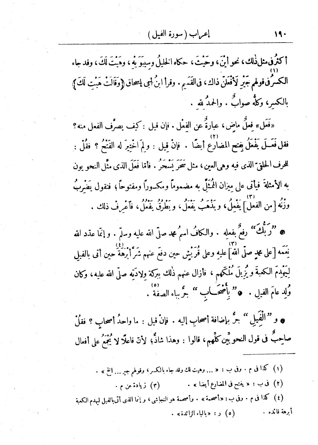 • "ربك" رفع بفعله. والكاف اسم محمد صلى الله عليه وسلم. وإنما عدد الله نعمه [على محمد صلى الله] عليه وعلى قريش حين دفع عنهم شر أبرهة حين أتى بالفيل ليهدم الكعبة ويزيل ملكهم، فأزال عنهم ذلك ببركة ولادته صلى الله عليه، وكان ولد عام الفيل.• "بأصحاب" جر بباء الصفة.