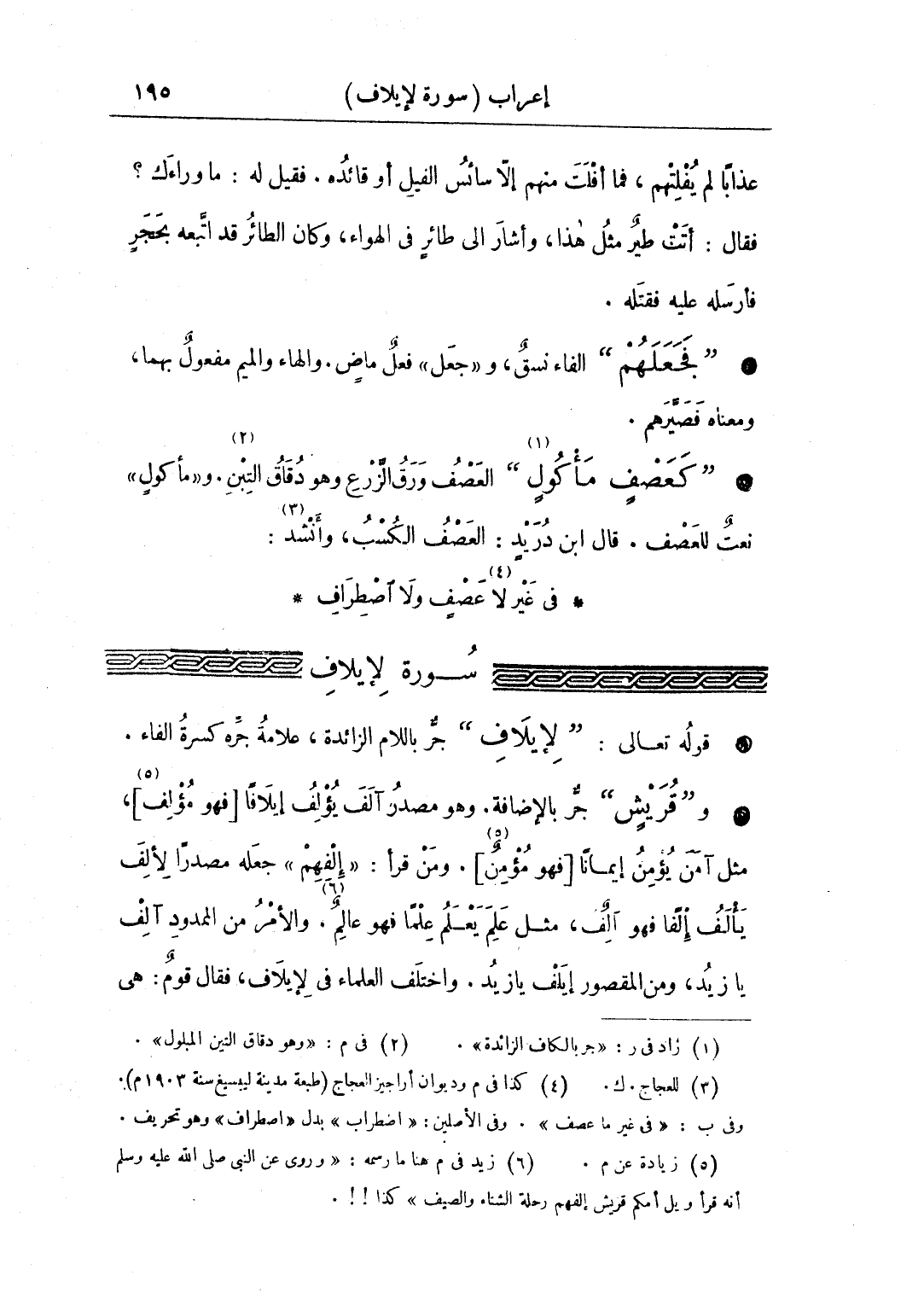 •و "قريش" جر بالإضافة. وهو مصدر آلف يؤلف إيلافا [فهو مؤلف]، مثل آمن يؤمن إيمانا [فهو مؤمن]. ومن قرأ: «إلفهم» جعله مصدرا لألف يألف إلفا فهو آلف، مثل علم يعلم علما فهو عالم. والأمر من الممدود آلف يا زيد، ومن المقصور إيلف يا زيد. واختلف العلماء في لأيلاف، فقال قوم: هي،
