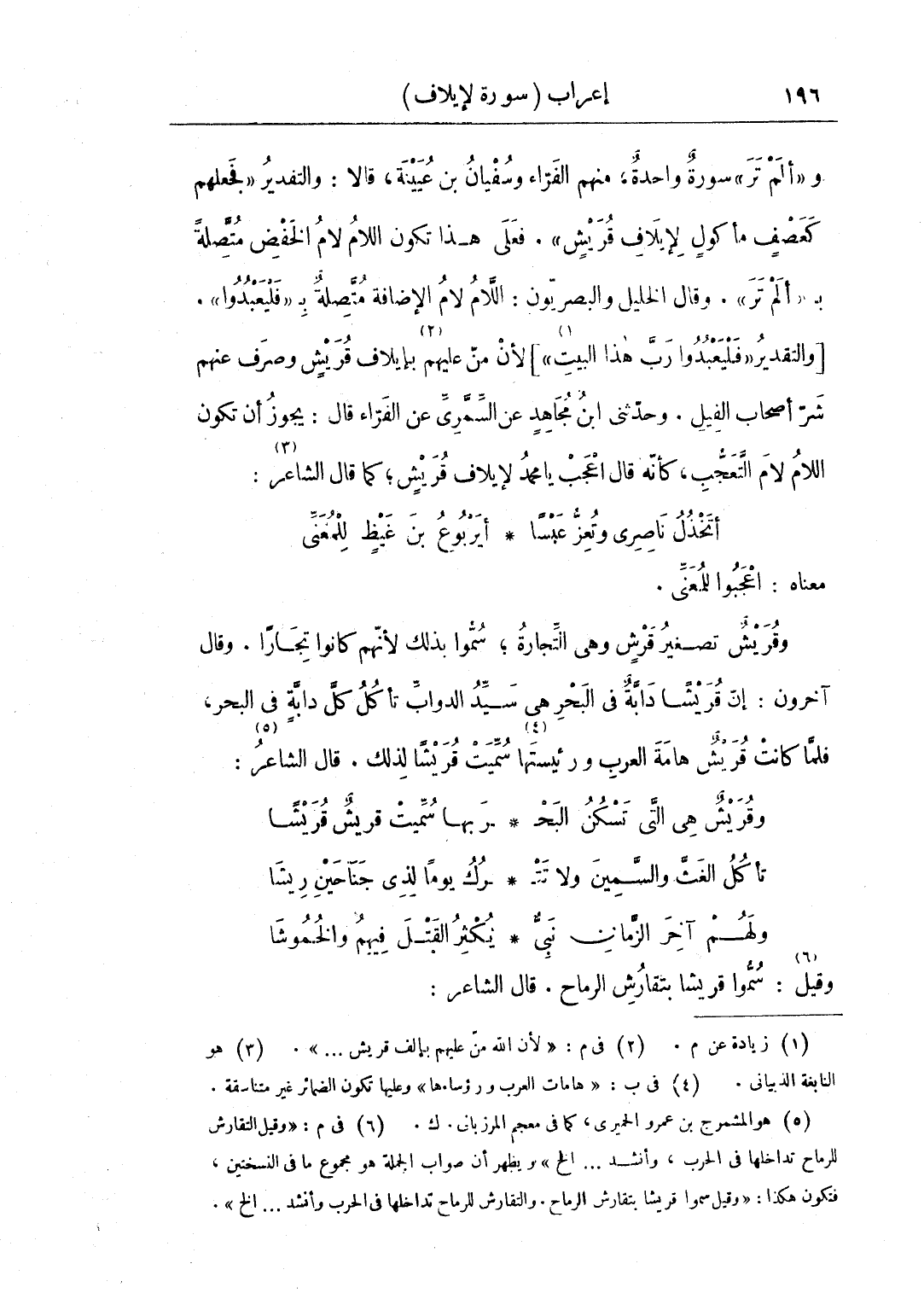 و «ألم تر» سورة واحدة، منهم الفراء وسفيان بن عيينة، قالا: والتقدير «فجعلهم كعصف مأكول لإيلاف قريش». فعلى هذا تكون اللام لام الخفض متصلة بـ «ألم تر». وقال الخليل والبصريون: اللام لام الإضافة متصلةبـ «فليعبدوا». [والتقدير «فليعبدوا رب هذا البيت»] لأن من عليهم بإيلاف قريش وصرف عنهم شر أصحاب الفيل. وحدثني ابن مجاهد عن السمري عن الفراء قال يجوز أن تكون اللام لام التعجب، كأنه قال اعجب يا محمد لإيلاف قريش؛ كما قال الشاعر: