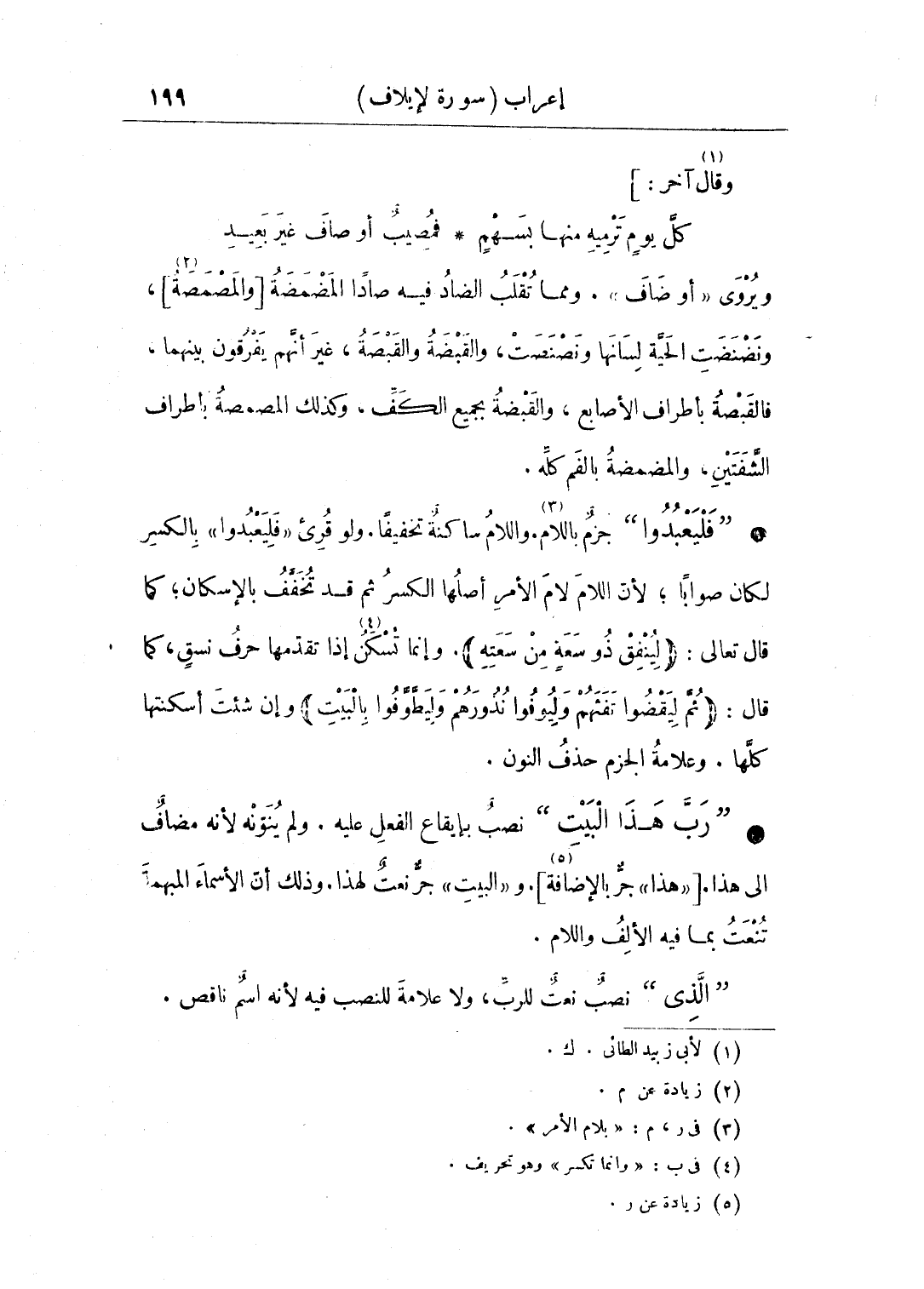 • "فليعبدوا" جزم باللام. واللام ساكنة تخفيفا. ولو قرئ «فليعبدوا» بالكسر لكان صوابا؛ لأن اللام لام الأمر أصلها الكسر ثم قد تخفف بالإسكان؛ كما قال تعالى: (لينفق ذو سعة من سعته). وإنما تسكن إذا تقدمها حرف نسق، كما قال: (ثم ليقضوا تفثهم وليوفوا نذورهم وليطوفوا بالبيت) وإن شئت أسكنتها كلها. وعلامة الجزم حذف النون.