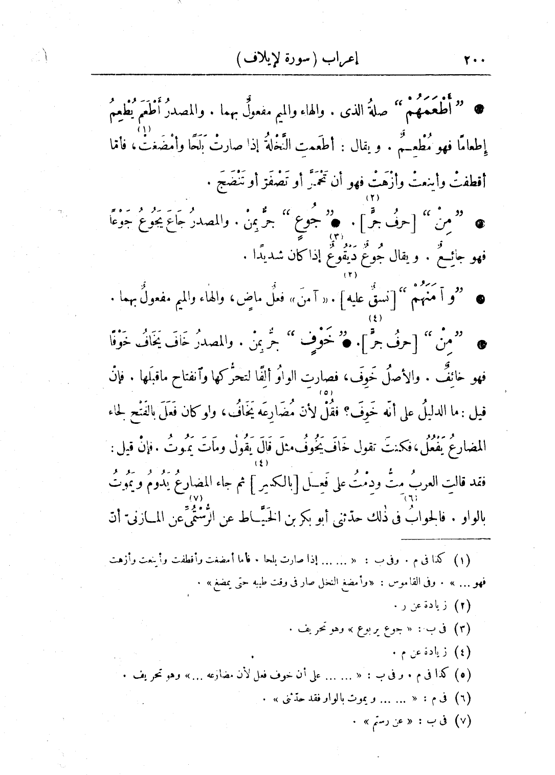 • "من" حرف جر. "خوف" جر بمن. والمصدر خاف يخاف خوفا فهو خائف. والأصل خَوِف، فصارت الواو ألفا لتحركها وانفتاح ما قبلها. فإن قيل: ما الدليل على أنه خوف؟ فقل لأن مضارعه يخاف، ولو كان فعل بالفتح لجاء المضارع يفعُل، فكنت تقول خاف يخوف مثل قال يقول ومات يموت. فإن قيل: فقد قالت العرب مت ودمت على فعل [بالكسر] ثم جاء المضارع يدوم ويموت بالواو. فالجواب في ذلك حدثني أبو بكر بن الخياط، عن الرستمي عن المازني أن