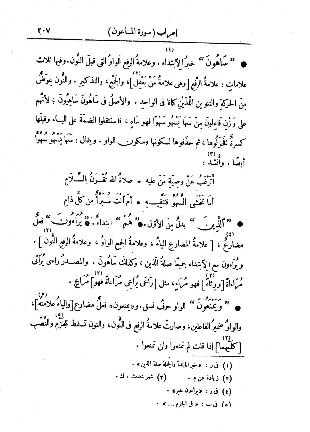 • "الذين" بدل من الأول. "هم" ابتداء. "يراءون" فعل مضارع، [علامة المضارع الياء، وعلامة الجمع الواو، وعلامة الرفع النون]. ويراءون مع الابتداء جميعا صلة الذين، وكذلك ساهون. والمصدر راءى يرائي مراءاة [ورئاء] فهو مراء، مثل [راعى يراعى مراعاة فهو] مراع.