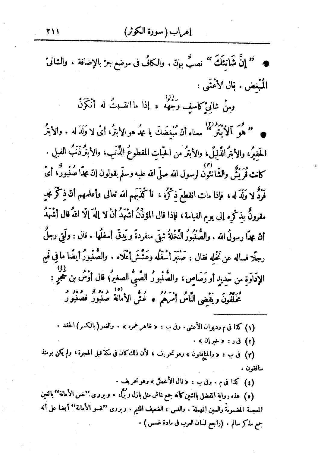 • "هو الأبتر" معناه أن مبغضك يا محمد هو الأبتر، أي لا ولد له. والأبتر الحقير، والأبتر الذليل، والأبتر من الحيات المقطوع الذنب والأبتر ذنب الفيل. كانت قريش والشانئون لرسول الله صلى الله عليه وسلم، يقولون إن محمد صنبور، أي فرد لا ولد له، فإذا مات انقطع ذكره، فأكذبهم الله تعالى وأعلمهم أن ذكر محمدٍ مقرون بذكره إلى يوم القيامة، فإذا قال المؤذن أشهد أن لا إله إلا الله قال أشهدُ أن محمدا رسول الله. والصنبور النخلة تبقى منفردة ويدق أسفلها. قال: ولقي رجلٌ رجلاً فسأله عن نخله فقال: صنبر أسفله وعشش أعلاه. والصنبور أيضًا ما في فم الإداوة من حديد أو رصاص. والصنبور الصبي الصغير؛ قال أوس بن حجر: