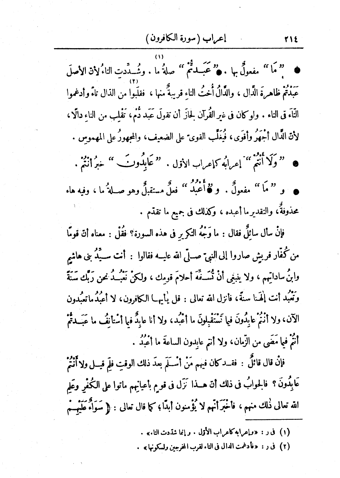 فإن سأل سائل فقال: ما وجه التكرير في هذه السورة؟ فقل: معناه أن قوما من كفار قريش صاروا إلى النبي صلى الله عليه فقالوا أنت سيد بني هاشم وابن ساداتهم، ولا ينبغي أن تسفه أحلام قومك، ولكن نعبد نحن ربك سنة وتعبد أنت إلهنا سنة، فأنزل الله تعالى: قل يأيها الكافرون، لا أعبد ما تعبدون الآن ولا أنتم عابدون فيما تستقبلون ما أعبد، ولا أنا عابد فيما أستأنف ما عبدتم أنتم فيما مضى من الزمان. ولا أنتم عابدون الساعة ما أعبد.