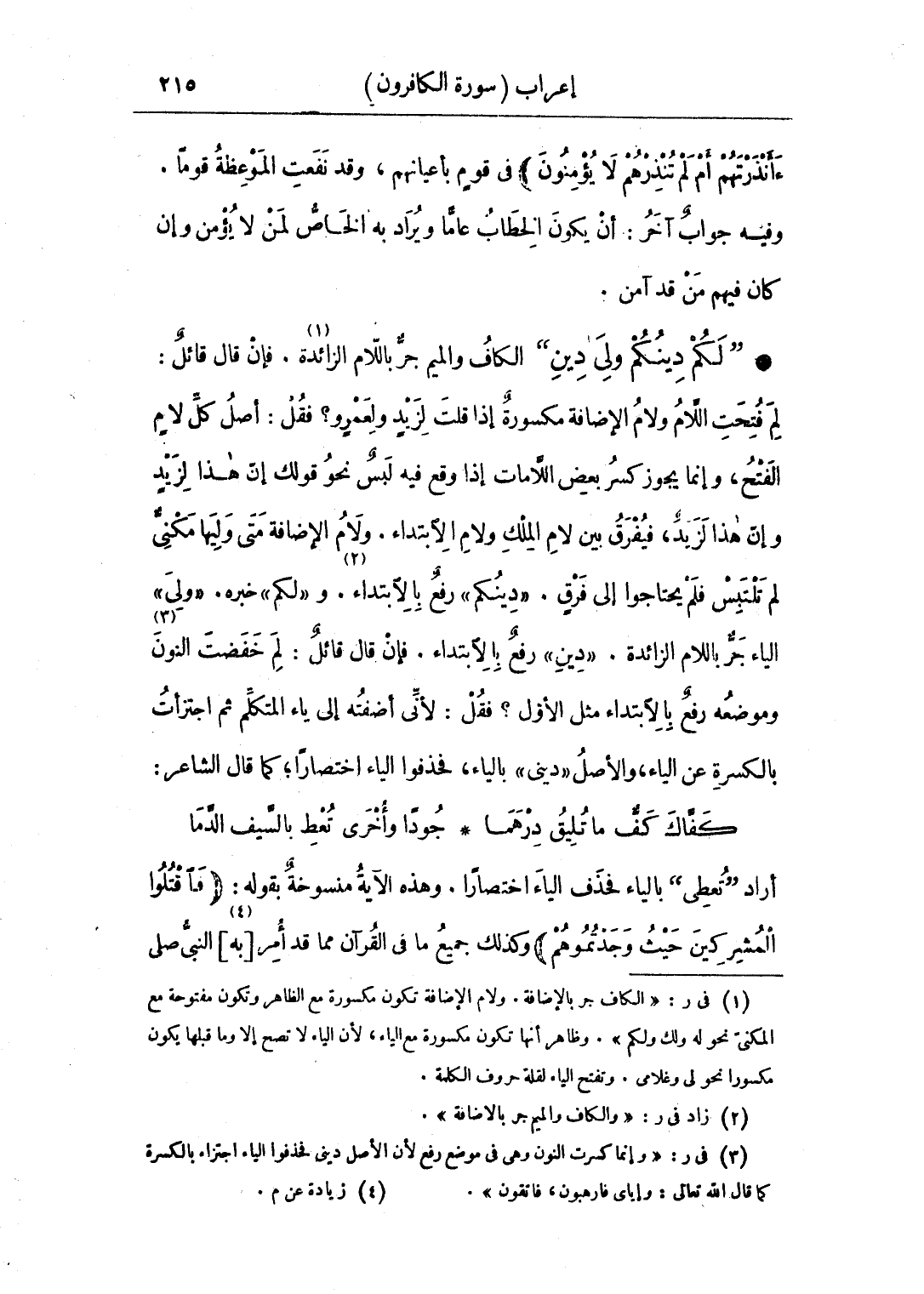 • "لكم دينكم ولي دين" الكاف والميم جر باللام الزائدة. فإن قال قائل: لم فتحت اللام ولام الإضافة مكسورة إذا قلت لزيد ولعمرو؟ فقل: أصل كل لام الفتح، وإنما يجوز كسر بعض اللامات إذا وقع فيه لبس نحو قولك إن هذا لزيد وإن هذا لزيد. فيفرق بين لام الملك ولام الابتداء. ولام الإضافة متى وليها مكني لم تلتبس فلم يحتاجوا إلى فرق. «دينكم» رفع بالابتداء. و «لكم» خبره. «ولي» الياء جر باللام الزائدة. «دين» رفع بالابتداء. فإن قال قائل: لم خفضت النون وموضعه رفع بالابتداء مثل الأول؟ فقل: لأني أضفته إلى ياء المتكلم ثم اجتزأت بالكسرة عن الياء، والأصل «ديني» بالياء، فحذفوا الياء اختصارا؛ كما قال الشاعر: