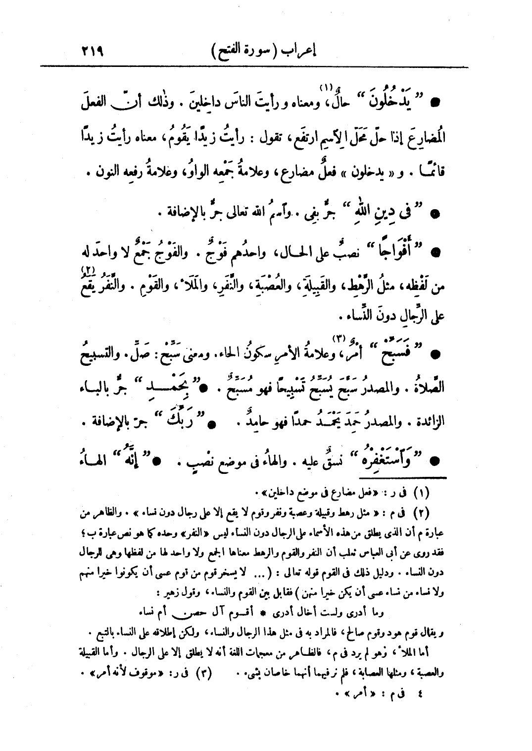 • "يدخلون" حال، ومعناه ورأيت الناس داخلين، وذلك أن الفعل المضارع إذا حل محل الاسم ارتفع، تقول: رأيت زيدا يقوم، معناه رأيت زيدا قائما. و «يدخلون» فعل مضارع، وعلامة جمعه الواو، وعلامة رفعه النون.
