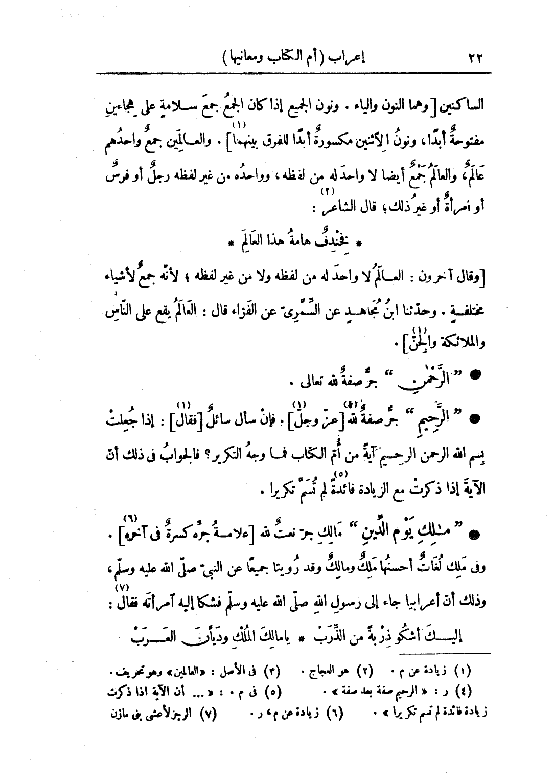 • "الرحيم": جرُّ صفةٌ لله [عز وجل]. فإن سأل سائل [فقال]: إذا جعلت بسم الله الرحمن الرحيم آية من أم الكتاب فما وجه التكرير؟ فالجواب في ذلك أن الآية إذا ذكرت مع الزيادة فائدة لم تسم تكريرا.