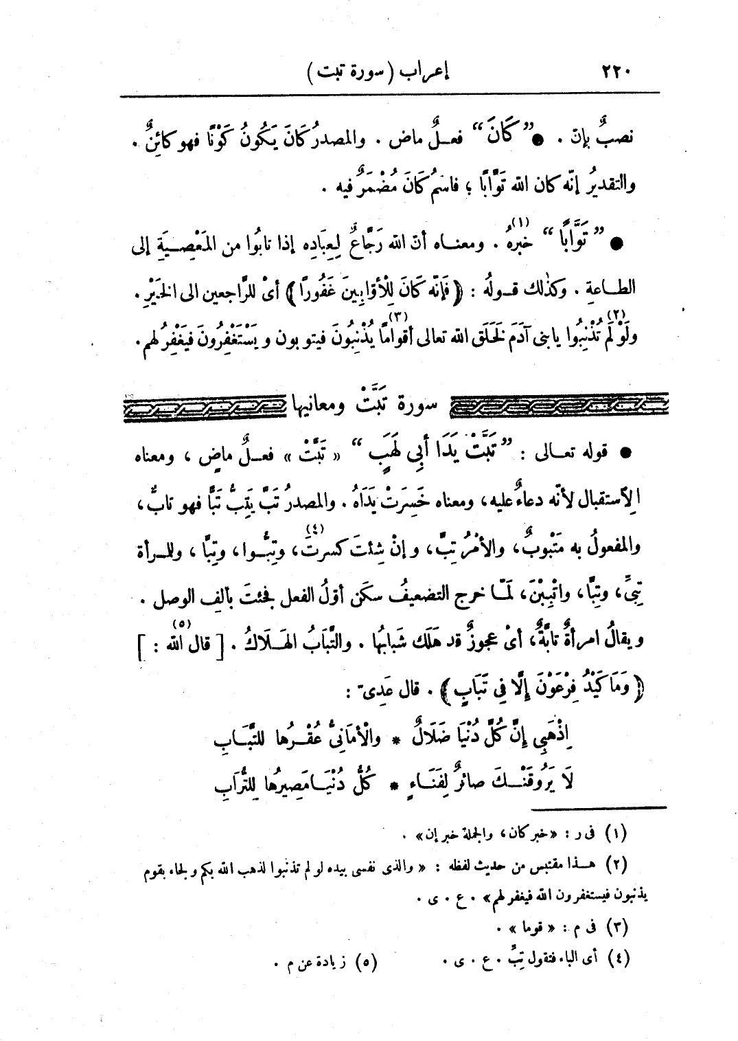 • قوله تعالى: "تبت يدا أبي لهب" «تبت» فعل ماض، ومعناه الاستقبال لأنه دعاء عليه، ومعناه خسرت يداه. والمصدر تب يتب تبا فهو تاب، والمفعول به متبوب، والأمر تب، وإن شئت كسرت، وتبوا وتبا، وللمرأة تبي وتبا، واتببن، لما خرج التضعيف سكن أول الفعل فجئت بألف الوصل. ويقال امرأة تابة. أي عجوزٌ قد هلك شبابها. والتباب الهلاك. [قال الله:] (وما كيد فرعون إلا في تباب). قال عدي:
