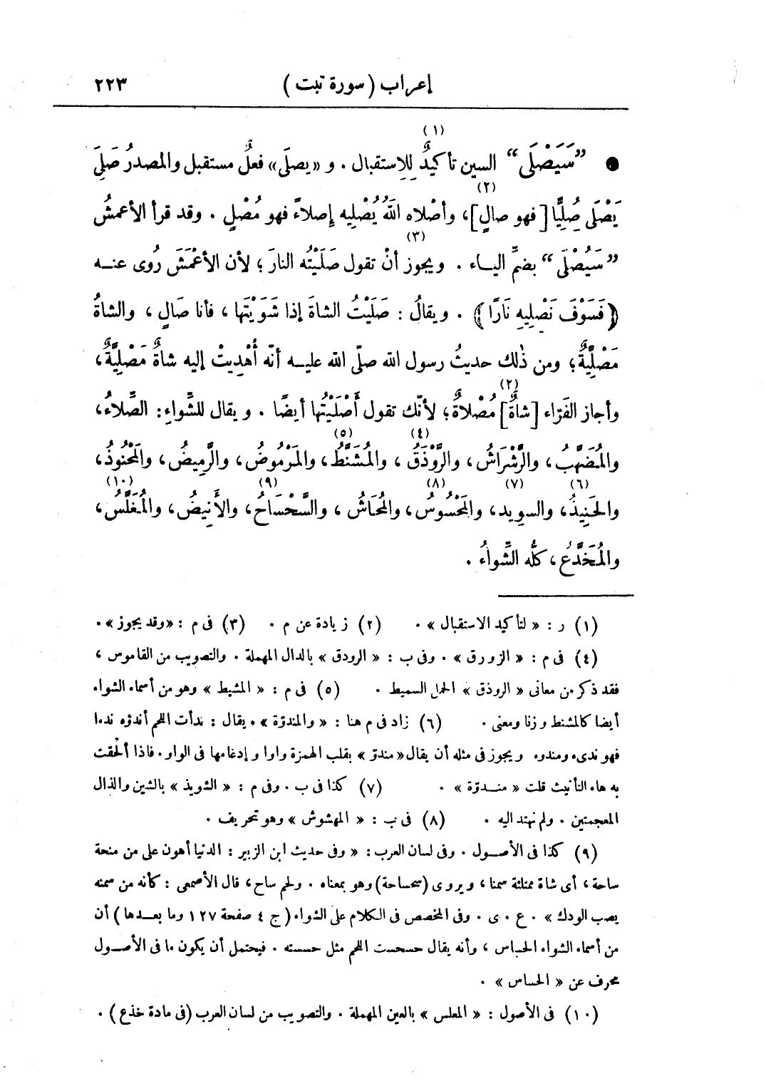 • "سيصلى" السين تأكيد للاستقبال. و «يصلى» فعل مستقبل والمصدر صلى يصلي صليا، [فهو صال]. وأصلاه الله يصليه إصلاء فهو مصل. وقد قرأ الأعمش "سيصلى" بضم الياء. ويجوز أن تقول صليته النار؛ لأن الأعمش روى عنه (فسوف نصليه نارا). ويقال: صليت الشاة إذا شويتها، فأنا صال، والشاة مصلية؛ ومن ذلك حديث رسول الله صلى الله عليه أنه أهديث إليه شاة مصلية، وأجاز الفراء [شاة] مصلاة،؛ لأنك تقول أصليتها أيضًا. ويقال للشواء: الصلاء، والمضهب، والرشراش، والروذق، والمشنط، والمرموض، والرميض، والمحنوذ، والحنيذ، والسويد، والمحسوس، والمحاش، والسحساح، والأنيض، والمغلس، والمخدع، كله الشواء.