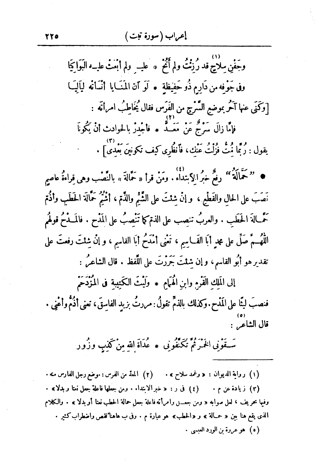 • "حمالة" رفع خبر الابتداء. ومن قرأ (حمالة) بالنصب وهي قراءة عاصم، نصب على الحال والقطع، وإن شئت على الشتم والذم، أشتم حمالة الحطب وأذم حمالة الحطب. والعرب تنصب على الذم كما تنصب على المدح. فالمدح قولهم اللهم صل على محمد أبا القاسم، تعني أمدح أبا القاسم، وإن شئت رفعت على تقدير هو أبو القاسم، وإن شئت جررت على اللفظ. قال الشاعر: