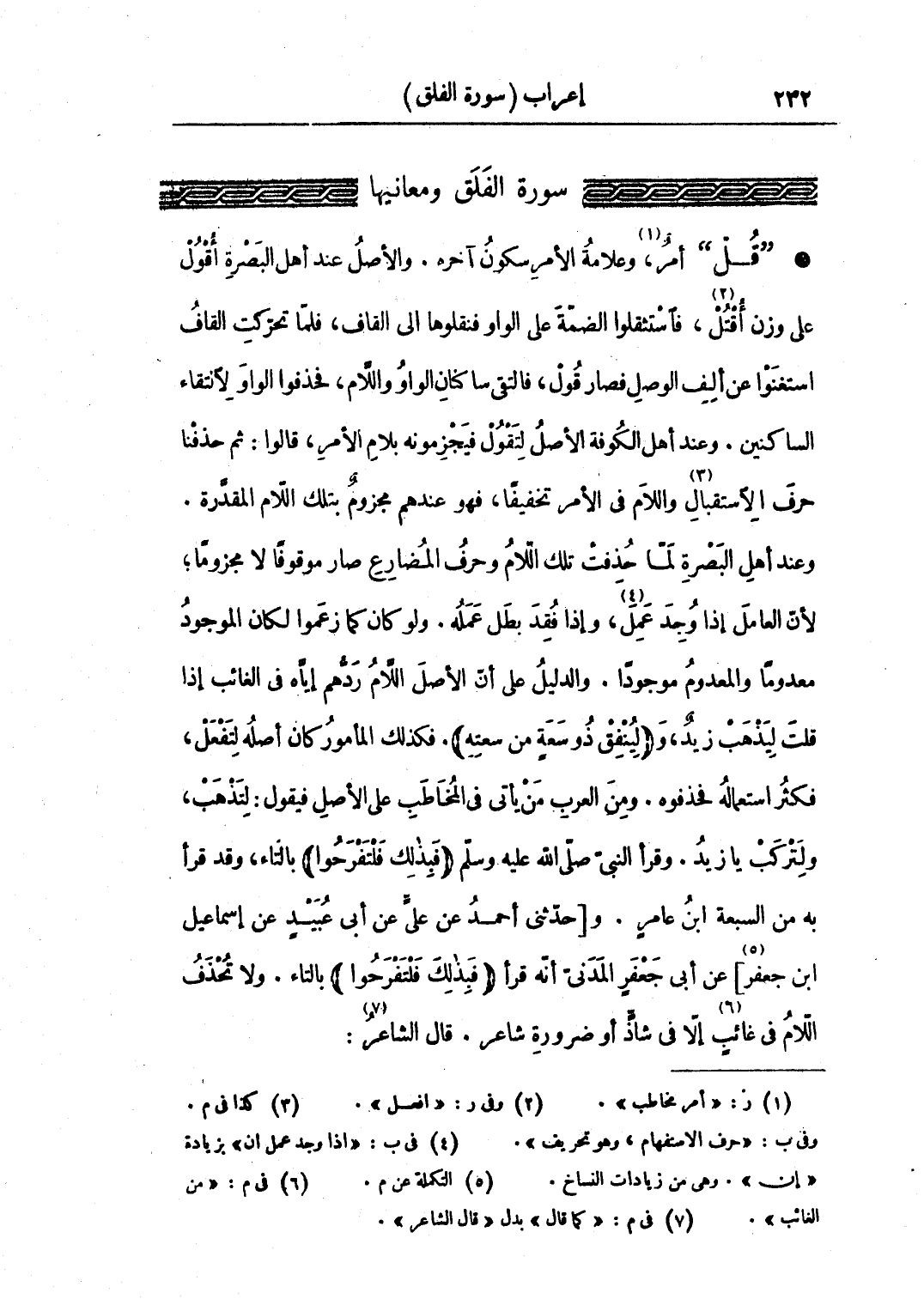 • "قل" أمر، وعلامة الأمر سكون آخره. والأصل عند أهل البصرة أقول على وزن أُقْتُلْ، فاستثقلوا الضمة على الواو فنقلوها إلى القاف، فلما تحركت القاف استغنوا عن ألف الوصل فصار قول، فالتقى ساكنان الواو واللام، فحذفوا الواو لالتقاء الساكنين، وعند أهل الكوفة الأصل لتقول فيجزمونه بلام الأمر، قالوا: ثم حذفنا حرف الاستقبال واللام في الأمر تخفيفا، فهو عندهم مجزوم بتلك اللام المقدرة. وعند أهل البصرة لما حذفت تلك اللام وحرف المضارع صار موقوفا، لا مجزوما؛ لأن العامل إذا وجد عمل، وإذا فقد بطل عمله. ولو كان كما زعموا لكان الموجود معدوما والمعدوم موجودا. والدليل على أن الأصل اللام ردهم إياه في الغائب إذا قلت ليذهب زيد، و (لينفق ذو سعة من سعته). فكذلك المأمور كان أصله لتفعل، فكثر استعماله فحذفوه. ومن العرب من يأتي في المخاطب على الأصل فيقول: لتذهب ولتركب يا زيد. وقرأ النبي صلى الله عليه وسلم (فبذلك فلتفرحوا) بالتاء، وقد قرأ به من السبعة ابن عامر. و [حدثني أحمد عن علي عن أبي عبيد عن إسماعيل بن جعفر] عن أبي جعفر المدني، أنه قرأ (فبذلك فلتفرحوا) بالتاء. ولا تحذف اللام في غائب إلا في شاذ أو ضرورة شاعر. قال الشاعر: