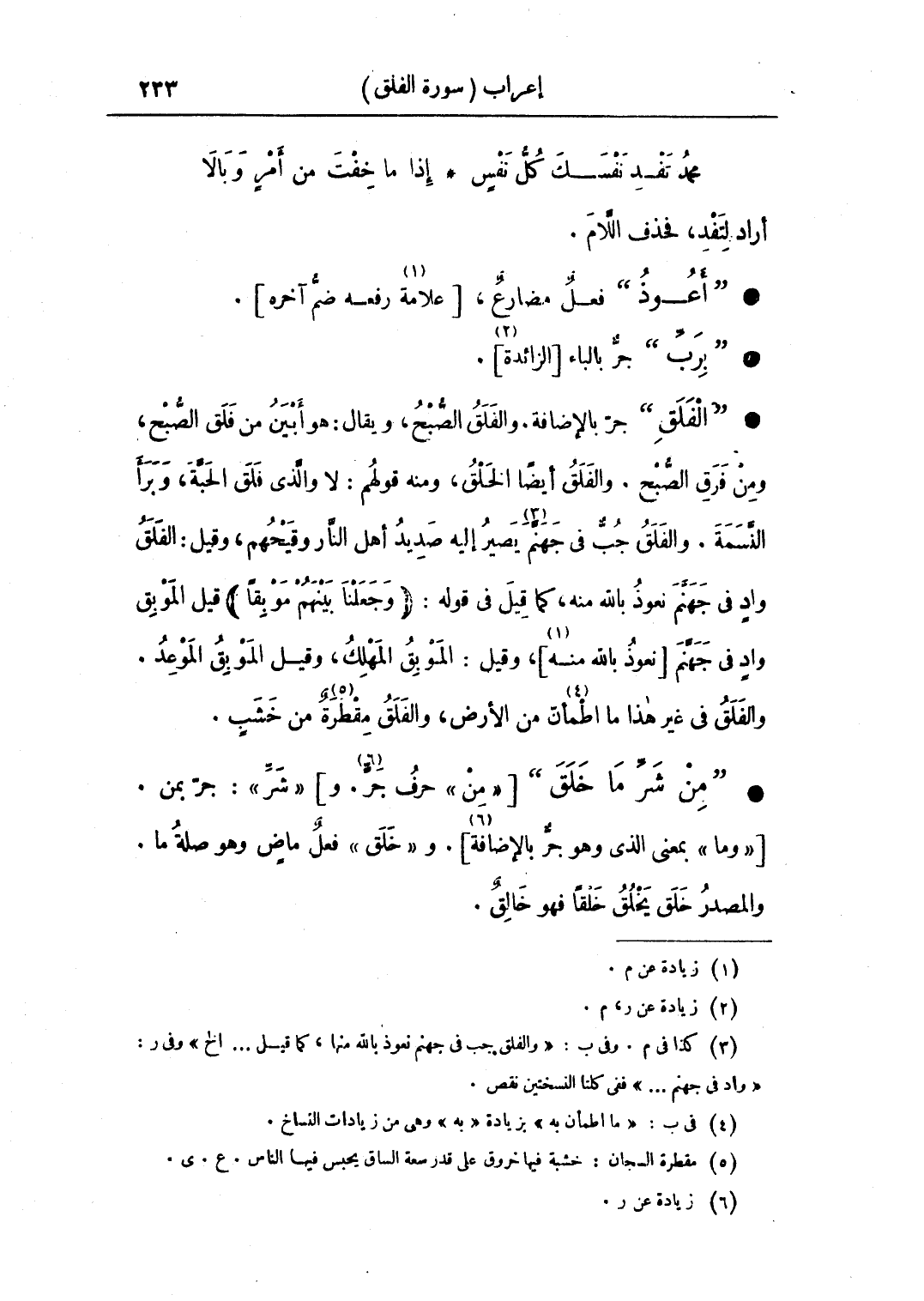 • "من شر ما خلق" [«من» حرف جر. و] «شر»: جر بمن. [(وما): بمعنى الذي وهو جر بالإضافة]. و «خلق» فعل ماض وهو صلة ما. والمصدر خلق يخلق خلقا فهو خالق.