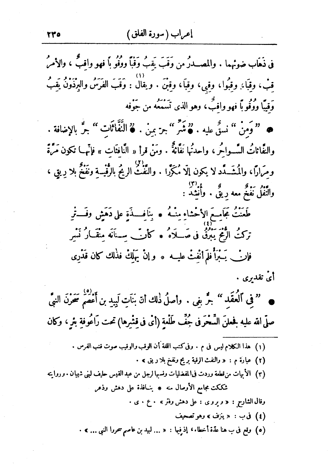 • "ومن" نسق عليه. "شر" جر بمن. "النفاثات" جر بالإضافة. والنفاثات السواحر، واحدتها نفاثة. ومن قرأ «النافثات» فإنها تكون مرة ومرارا، والمشدد لا يكون إلا مكررا. والنفث الريح بالرقية ونفخ بلا ريق، والتفل نفخ معه ريق. وأنشد: