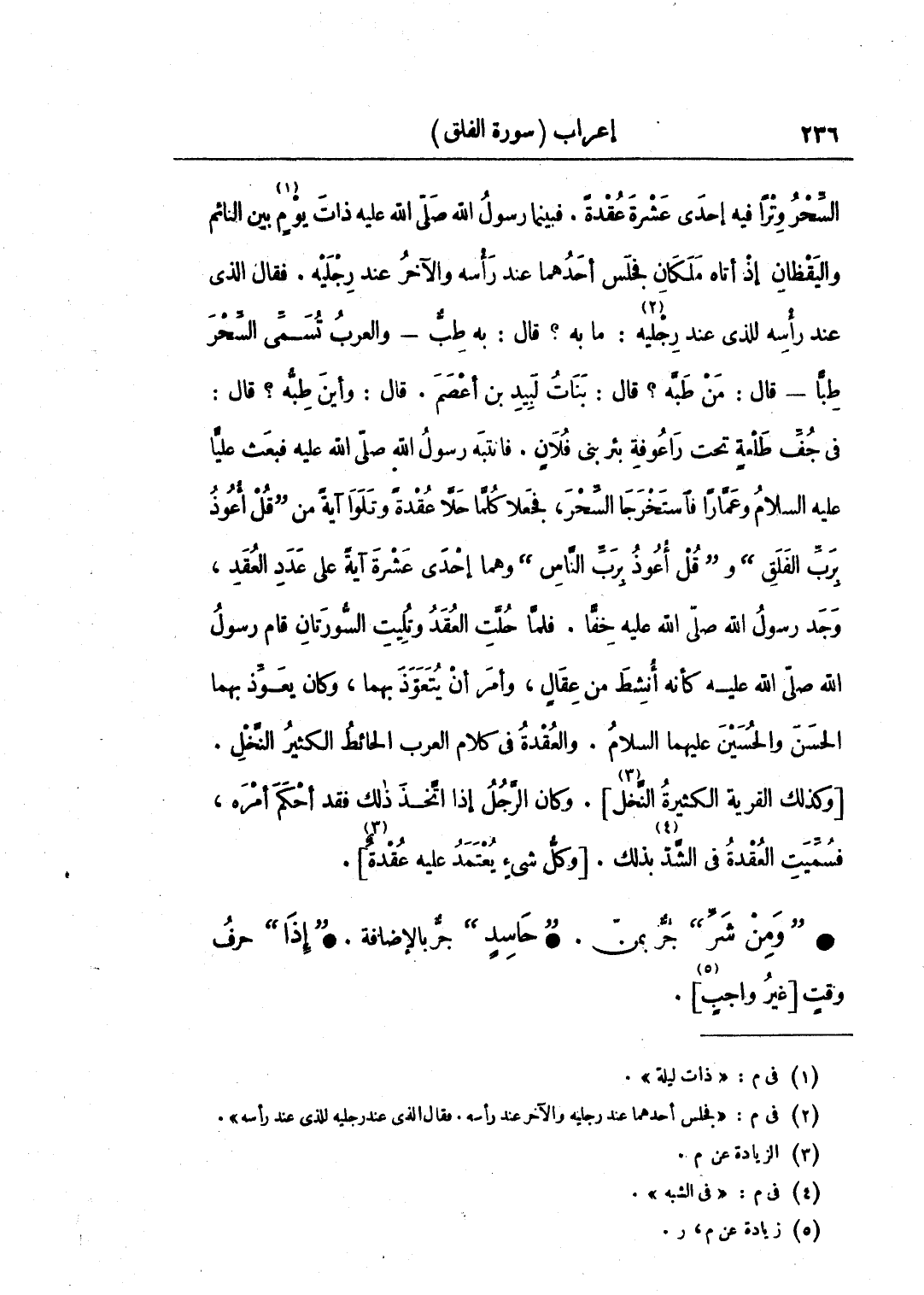 السحر وترًا فيه إحدى عشرة عقدة. فبينما رسول الله صلى الله عليه ذات يوم بين النائم واليقظان إذ أتاه ملكان فجلس أحدهما عند رأسه والآخر عند رجليه. فقال الذي عند رأسه للذي عند رجليه: ما به؟ قال: به طب- والعرب تسمى السحر طبا- قال من طبه؟ قال: بنات لبيد بن أعصم. قال وأين طبه؟ قال في جف طلعة تحت راعوفة بئر بني فلان. فانتبه رسول الله صلى الله عليه فبعث عليا عليه السلام وعمارا فاستخرجا السحر، فجعلا كلما حلا عقدة وتلوا آية من "قل أعوذ برب الفلق"، و "قل أعوذ برب الناس" وهما إحدى عشرة آية على عدد العقد، وجد رسول الله صلى الله عليه خفا. فلما حلت العقد وتليت السورتان قام رسول الله صلى الله عليه كأنه أنشط من عقال. وأمر أن يتعوذ بهما، وكان يعوذ بهما الحسن والحسين عليهما السلام. والعقدة في كلام العرب الحائط الكثير النخل. [وكذلك القرية الكثيرة النخل]. وكان الرجل إذا اتخذ ذلك فقد أحكم أمره، فسميت العقدة في الشد بذلك. وكل شيء يعتمد عليه عقدة.
