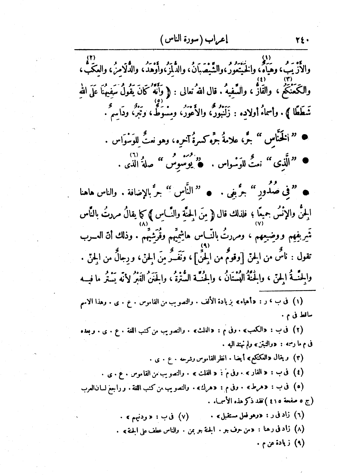• "في صدور" جر بفي. "الناس" جر بالإضافة. والناس ها هنا الجن والإنس جميعا؛ فلذلك قال (من الجنة والناس) كما يقال مررت بالناس شريفهم ووضيعهم ومررت بالناس هاشميهم وقرشيهم. وذلك أن العرب تقول: ناس من الجن [وقوم من الجن]، ونفر من الجن، ورجال من الجن، والجنة والجن، والجنة البستان، والجنة السترة، والجنن القبر لأنه يستر ما فيه