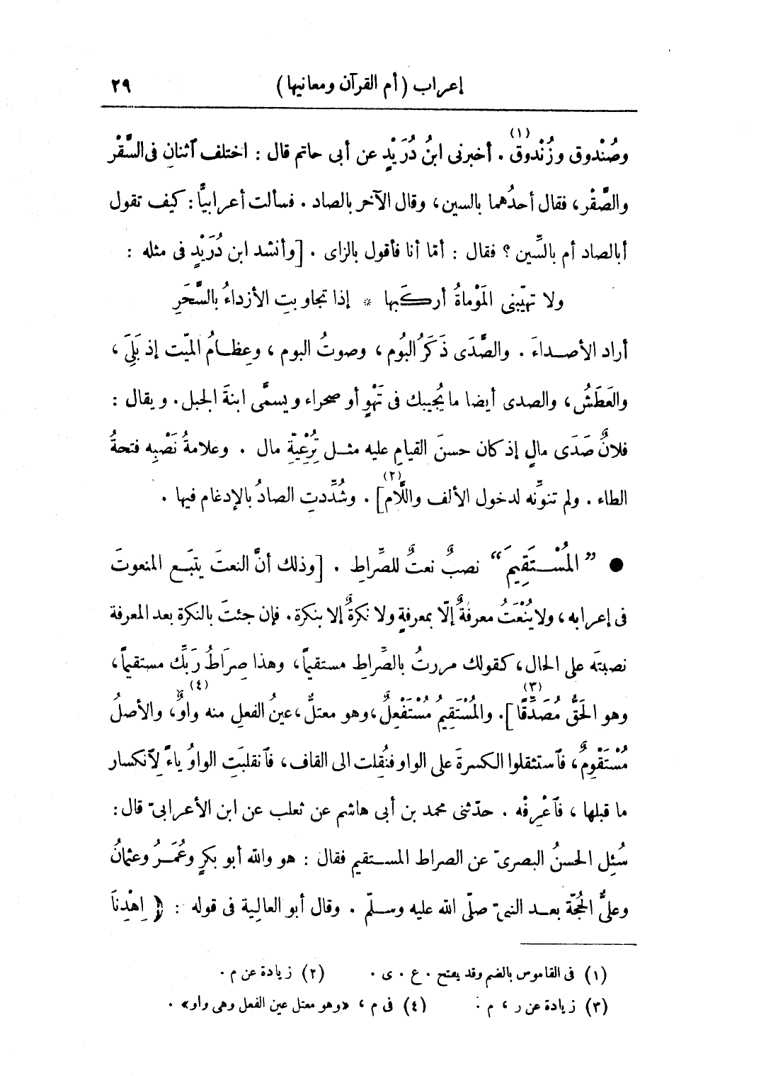 • "المستقيم": نصب نعت للصراط. [وذلك أن النعت يتبع المنعوت في إعرابه، ولا ينعت معرفة إلا بمعرفة ولا نكرة إلا بنكرة، فإن جئت بالنكرة بعد المعرفة نصبته على الحال، كقولك مررت بالصراط مستقيما، وهذا صراط ربك مستقيما، وهو الحق مصدقا]. والمستقيم مستفعل، وهو معتل، عين الفعل منه واوٌ، والأصلُ مستقومٌ، فاستثقلوا الكسرةَ على الواو فنقلت إلى القاف، فانقلبَت الواوُ ياءً لانكسار ما قبلها، فاعرفه. حدثني محمد بن أبي هاشم عن ثعلب عن ابن الأعرابي قال: سئل الحسن البصري عن الصراط المستقيم، فقال: هو والله أبو بكر وعمر وعثمان وعلي الحجة بعد النبي صلى الله عليه وسلم، وقال أبو العالية في قوله: (اهدنا