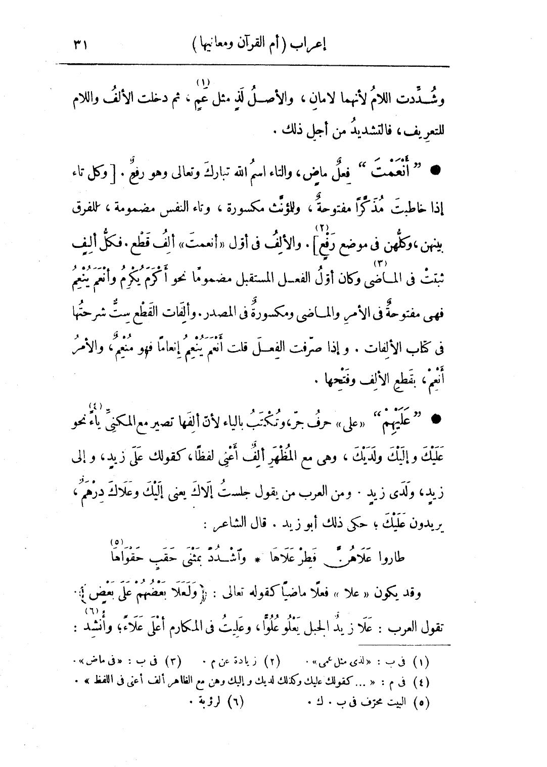 • "أنعمت": فعل ماض، والتاء اسم الله تبارك وتعالى وهو رفعٌ. [وكل تاء إذا خاطبتَ مذكرا مفتوحة، وللمؤنث مكسورة، وتاء النفس مضمومة، للفرق بينهن، وكلهن في موضع رفع]. والألف في أول «أنعمت» ألف قطع. فكل ألف ثبتت في الماضي وكان أول الفعل المستقبل مضموما نحو أكرم يكرم وأنعم ينعم، فهي مفتوحة في الأمر والماضي ومكسورة في المصدر. وألفات القطع ست شرحتها في كتاب الألفات. وإذا صرفت الفعل قلت أنعم ينعم إنعاما فهو منعم، والأمر أنعم، بقطع الألف وفتحها.