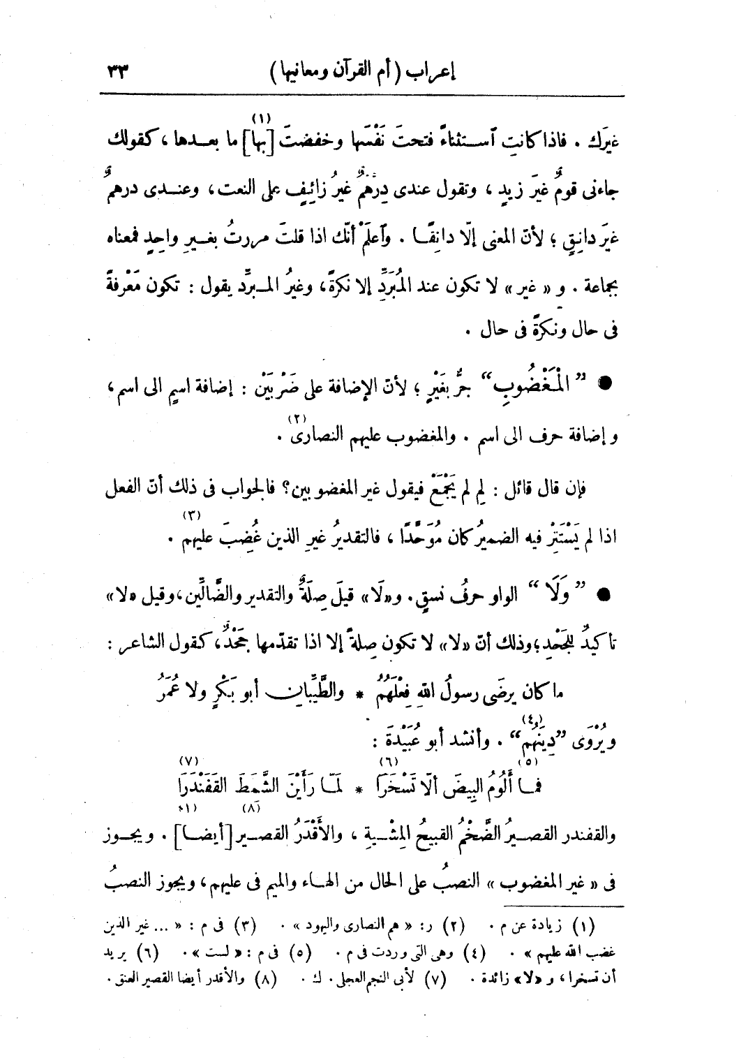 • "المغضوب": جر بغير، لأن الإضافة على ضربين: إضافة اسم إلى اسم، وإضافة حرف إلى اسم. والمغضوب عليهم النصارى.