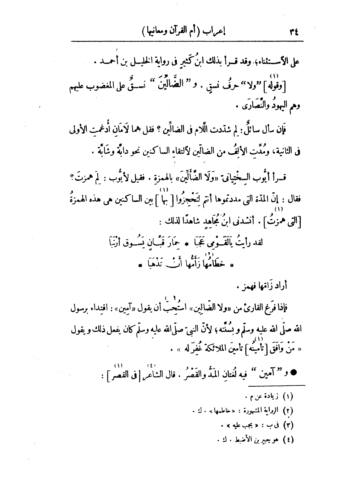 قرأ أيوب السختياني: «ولا الضأَلِّين» بالهمزة، فقيل لأيوب: لم همزت؟ قفال: إن المدة التي مددتموها أنتم لتحجزوا [بها] بين الساكنين هي هذه الهمزة [التي همزت]. أنشدني ابن مجاهد شاهدًا لذلك: