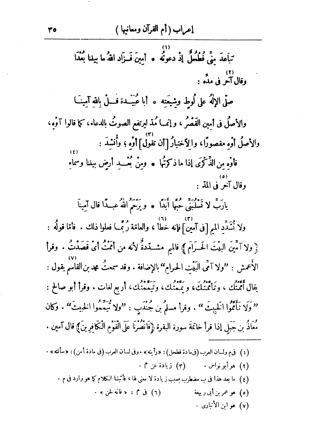 ولا تشدد الميم [في آمين] فإنه خطأ، والعامة ربما فعلوا ذلك. فأما قوله (ولا آمين البيت الحرام) فالميم مشددة لأنه من أممت أي قصدتُ. وقرأ الأعمش: "ولا آمي البيت الحرام" بالإضافة. وقد سمعت محمد بن القاسم يقول: يقال أممتك، وتأممتك، ويممتك، وتيممتك، أربع لغات. وقرأ أبو صالح: "ولا تأمموا الخبيث". وقرأ مسلم بن جندب:" ولا تُيَمموا الخبيث". وكان معاذ بن جبل إذا قرأ خاتمة سورة البقرة (فانصرنا على القوم الكافرين) قال آمين.