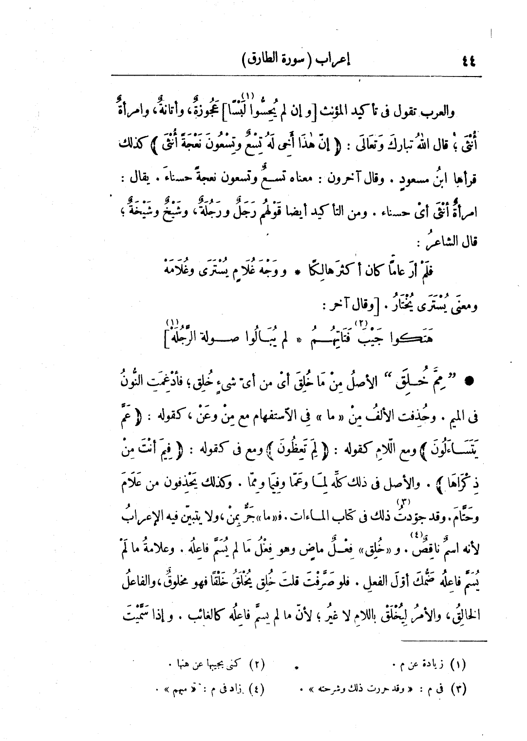 • "مم خلق" الأصل من ما خُلق، أي من أي شيء خُلق؛ فأدغمت النون في الميم. وحذفت الألف من «ما» في الاستفهام مع من وعن، كقوله: (عم يتساءلون) ومع اللام كقوله: (لم تعظون) ومع في كقوله: (فيم أنت من ذكراها). والأصل في ذلك كله لما وعما وفيما ومما. وكذلك يحذفون من علام وحتام. وقد جودت ذلك في كتاب الماءات. ف «ما» جر بمن، ولا يتبين فيه الإعراب لأنه اسم ناقص. و «خلق» فعل ماض وهو فعل ما لم يسم فاعله. وعلامة ما لم يسم فاعله ضمك أول الفعل. فلو صرفت قلت خلق يخلق خلقا فهو مخلوقٌ، والفاعل الخالق، والأمر ليخلق باللام لا غير؛ لأن ما لم يسم فاعله كالغائب. وإذا سميت