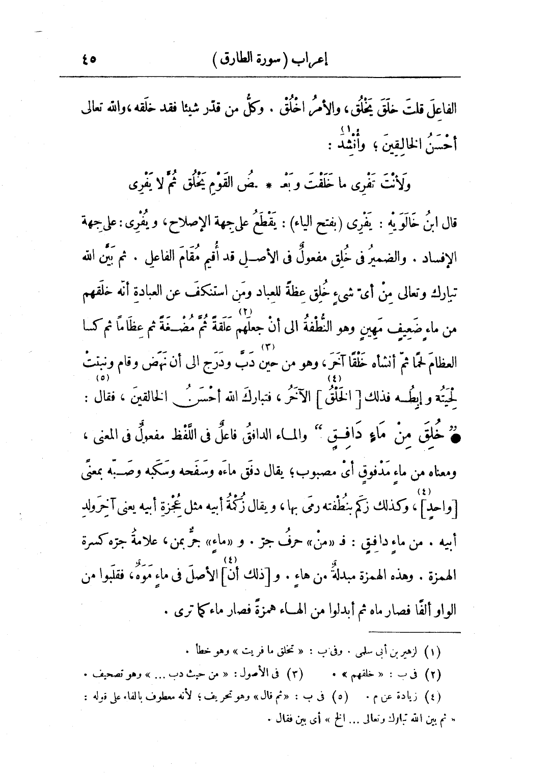 قال ابن خالويه: يفري (بفتح الياء): يقطع على جهة الإصطلاح، ويُفرى: على جهة الإفساد. والضمير في خلق مفعول في الأصل قد أقيم مقام الفاعل. ثم بين الله تبارك وتعالى من أي شيء خلق عظة للعباد ومن استنكف عن العبادة أنه خلقهم من ماء ضعيف مهين وهو النطفة إلى أن جعلهم علقة ثم مضغة ثم عظامًا ثم كسا العظام لحمًا ثم أنشأه خلقاً آخر، وهو من حين دب ودرج إلى أن نهض وقام ونبتت لحيته وإبطه فذلك [الخلق] الآخر، فتبارك الله أحسن الخالقين، فقال:
