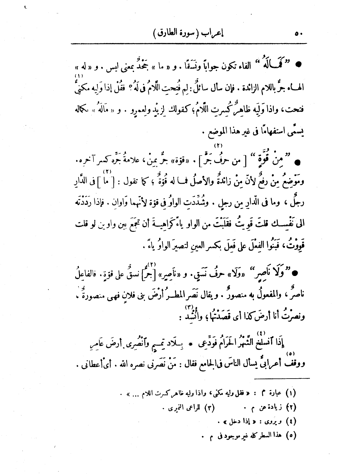 • (من قوة): [من حرف جر]. «قوة» جر بمن، علامة جره كسر آخره. وموضع من رفع لأن من زائدة والأصل فما له قوة؛ كما تقول: [ما] في الدار رجل، وما في الدار من رجل. وشددت الواو في قوة لأنهما واوان. فإذا رددته إلى نفسك قلت قويت فقلبت ياء كراهية أن تجمع بين واوين لو قلت قووت، فبنوا الفعل على فعل بكسر العين لتصير الواو ياء.