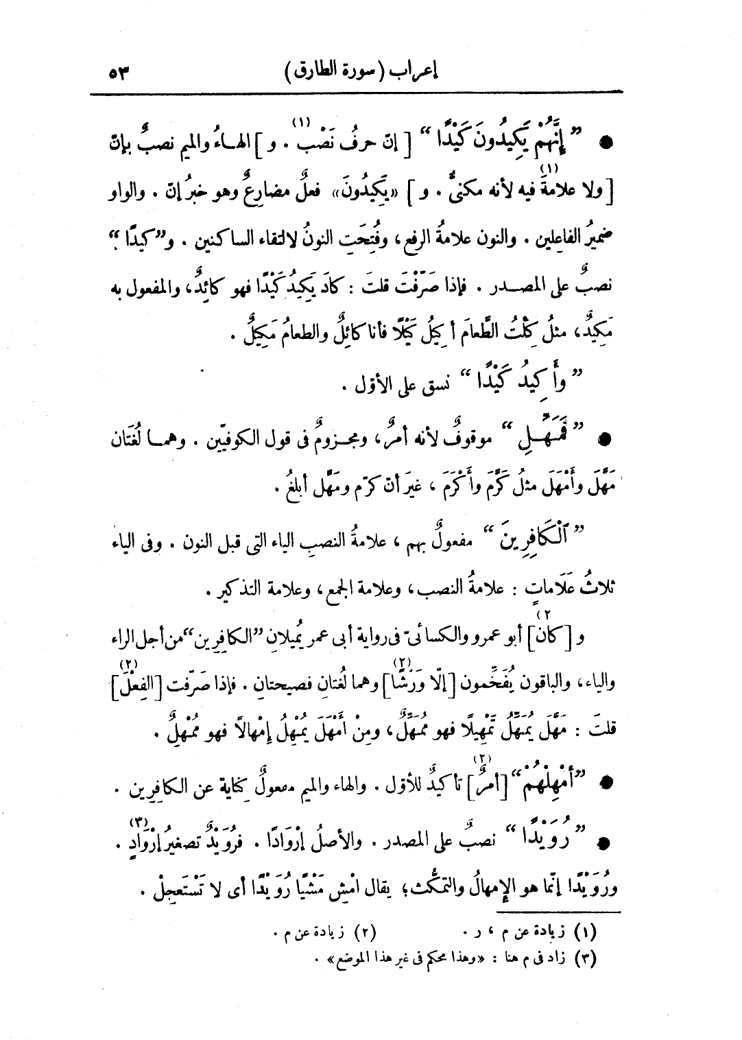 • "إنهم يكيدون كيدا" [إن حرف نصب. و] الهاء والميم نصب بإن [ولا علامة فيه لأنه مكنى. و] «يكيدون» فعل مضارع وهو خبر إن. والواو ضمير الفاعلين. والنون علامة الرفع، وفتحت النون لالتقاء الساكنين. "وكيدا" نصب على المصدر. فإذا صرفت قلت: كاد يكيد كيدًا فهو كائدٌ، والمفعول به مكيد، مثل كلت الطعام أكيل كيلا فأنا كائل والطعام مكيل.
