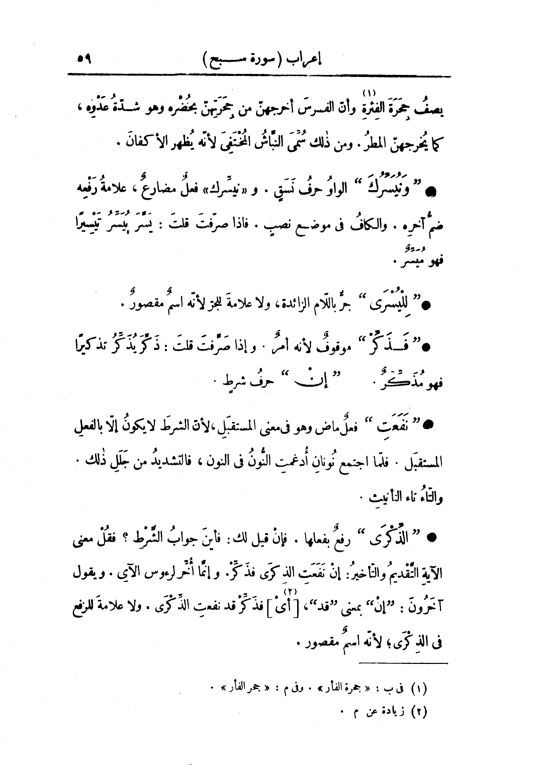 • "الذكرى" رفع بفعلها. فإن قيل لك: فأين جواب الشرط؟ فقل معنى الآية التقديم والتأخير: إن نفعت الذكرى فذكر. وإنما أخر لرءوس الآي. ويقول آخرون: "إن" بمعنى "قد"، [أي] فذكر قد نفعت الذكرى. ولا علامة للرفع في الذكرى لأنه اسم مقصور.