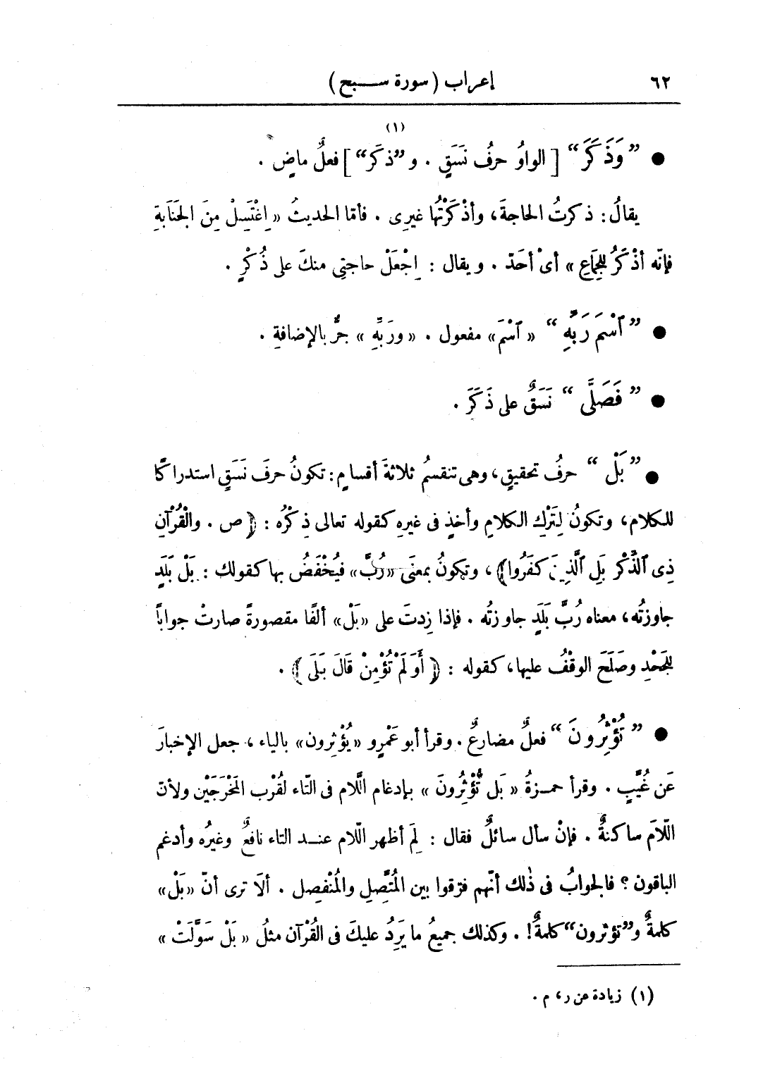 • "بل" حرف تحقيق، وهي تنقسم ثلاثة أقسام: تكون حرف نسق استدراكا للكلام، وتكون لترك الكلام، وأخذ في غيره كقوله تعالى ذكره: (ص. والقرآن ذي الذكر بل الذين كفروا)، وتكون بمعنى «رب» فيخفض بها كقولك: بل بلد جاوزته، معناه رب بلد جاوزته. فإذا زدت على «بل» ألفا مقصورةً صارت جوابًا للجحد وصلح الوقف عليها، كقولك: (أو لم تؤمن قال: بلى).
