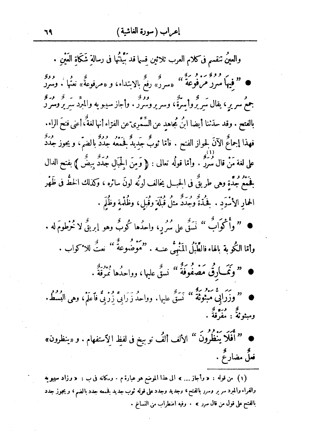 • "فيها سرر مرفوعة" «سرر» رفع بالابتداء، و «مرفوعة» نعتها. وسرر جمع سرير، يقال سرير وأسرة، وسرير وسرر. وأجاز سيبويه، والمبرد سرير وسرر بالفتح. وقد حدثنا أيضًا ابن مجاهد عن السمري عن الفراء أنها لغة، أعني فتح الراء. فهذا إجماع الآن لجواز الفتح. فأما ثوب جديد فجمعه جدد بالضم، ويجوز جُدَدٌ على لغة من قال سُرَرٌ. وأما قوله تعالى: (ومن الجبال جدد بيض) بفتح الدال فجمع جُدّة وهي طريق في الجبل يخالف لونه لون سائره، وكذلك الخط في ظهر الخمار الأسود. فجدة وجدد مثل قبلة وقبل، وظلمة وظلم.