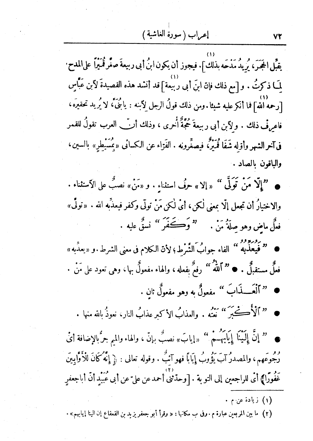 • "إلا من تولى" «إلا» حرف استثناء. و «من» نصب على الاستثناء. والاختيار أن تجعل إلا بمعنى لكن، أي لكن من تولى وكفر فيعذبه الله. «تولى» فعل ماض وهو صلة من. "وكفر" نسق عليه.
