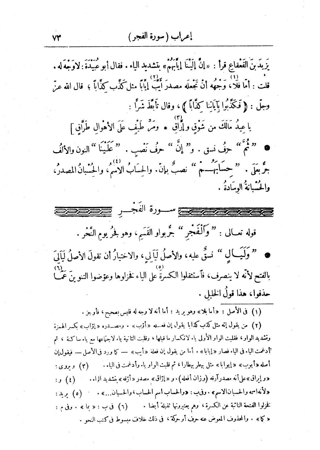 يزيد بن القعقاع قرأ: «إن إلينا إيَّابهم» بتشديد الياء. فقال أبو عبيدة: لا وجه له. قلت: أما فلا، وجهه أن تجعله مصدر أيب إيابا مثل كذب كذابا؛ قال الله عز وجل: (فكذبوا بآياتنا كذابا)، وقال تأبط شرًا: