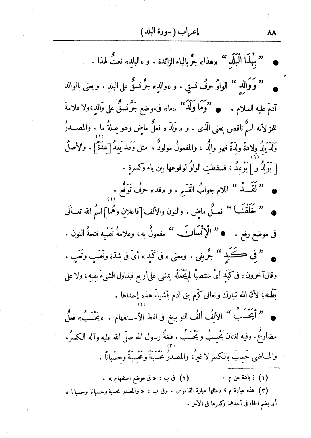 • "ووالد" الواو حرف نسق. و «والد» جر نسق على البلد. ويعني بالوالد آدم عليه السلام. "وما ولد" «ما» في موضع جر نسق على والد، ولا علامة للجر لأنه اسم ناقص بمعنى الذي. و «ولد» فعل ماض وهو صلة ما. والمصدر ولد يلد ولادة ولدة فهو والد، والمفعول مولود، مثل وعد يعد [عدة]. والأصل [يولد و] يوعد، فسقطت الواو لوقوعها بين ياء وكسرة.