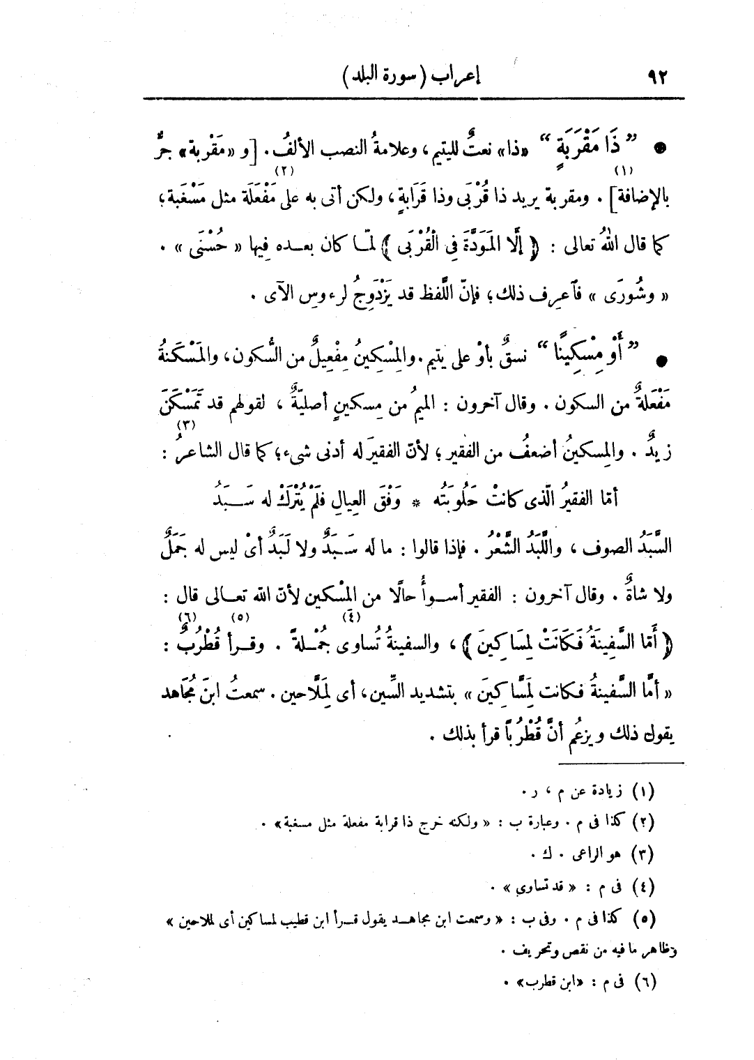 • "ذا مقربة" «ذا» نعت لليتيم، وعلامة النصب الألف. [و «مقربة» جر بالإضافة]. ومقربة يريد ذا قربى وذا قرابة، ولكن أتى به على مفعلة مثل مسغبة؛ كما قال الله تعالى: (إلا المودة في القربى) لما كان بعده فيها «حسنى». «وشورى» فاعرف ذلك؛ فإن اللفظ قد يزدوج لرءوس الآي.