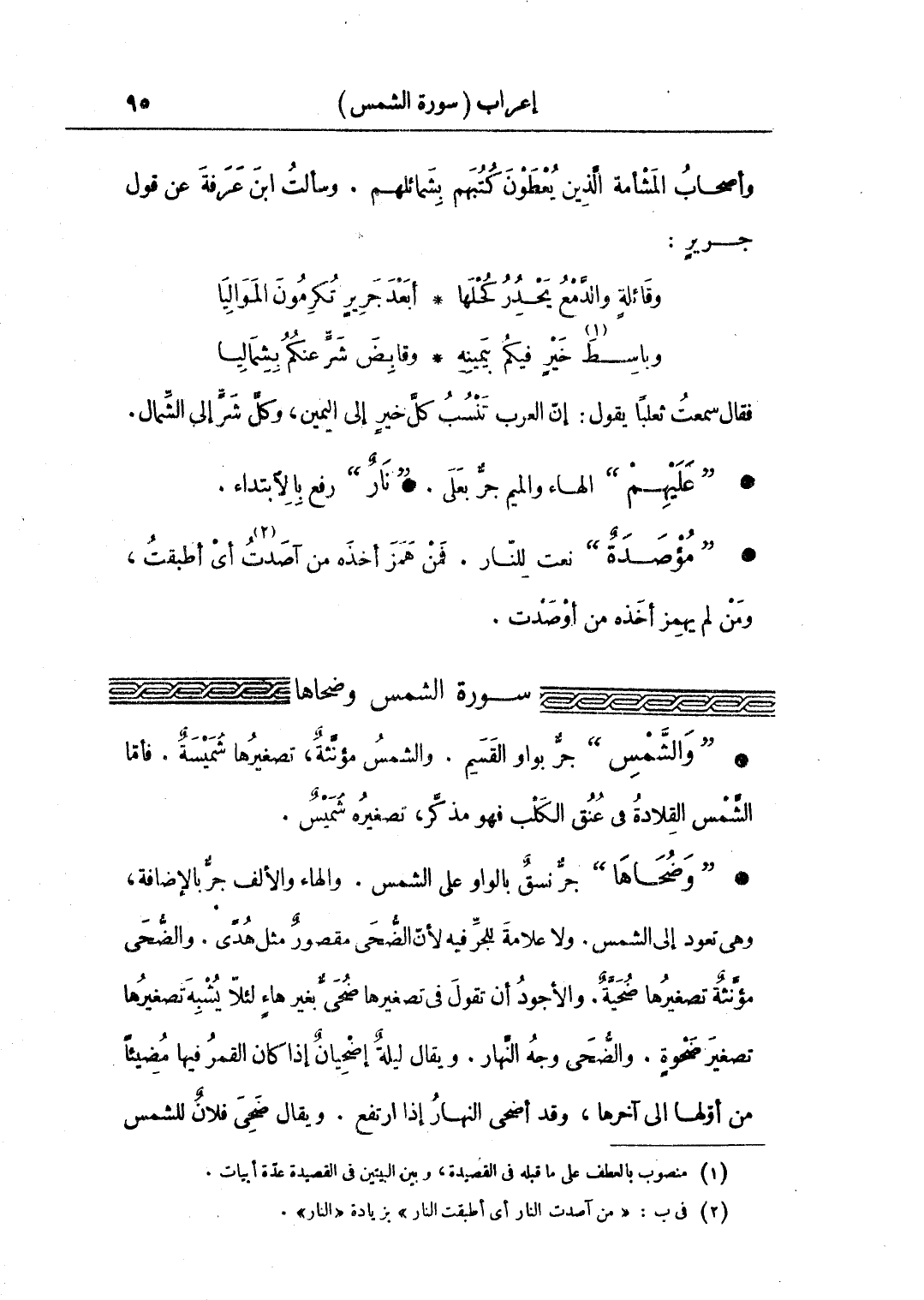 • "والشمس" جر بواو القسم. والشمس مؤنثة، تصغيرها شميسة. فأما الشمس القِلادة في عنق الكلب فهو مذكر، تصغيره شُميس.
