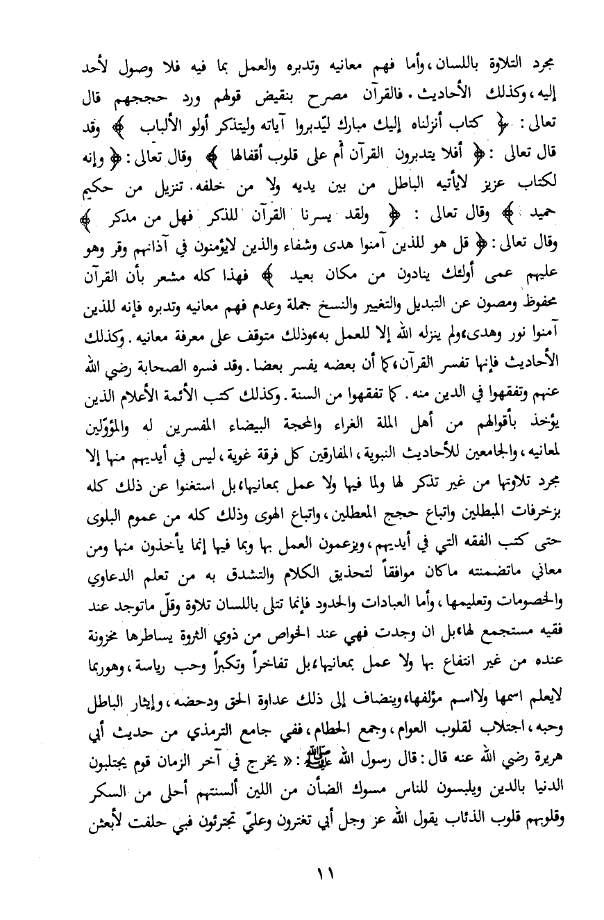 مجرد التلاوة باللسان، وأما فهم معانيه وتدبره والعمل بما فيه فلا وصول لأحد إليه، وكذلك الأحاديث. فالقرآن مصرح بنقيض قولهم ورد حججهم قال تعالى: {كِتَابٌ أَنْزَلْنَاهُ إِلَيْكَ مُبَارَكٌ لِيَدَّبَّرُوا آيَاتِهِ وَلِيَتَذَكَّرَ أُولُو الْأَلْبَابِ} وقد قال تعالى: {أَفَلا يَتَدَبَّرُونَ الْقُرْآنَ أَمْ عَلَى قُلُوبٍ أَقْفَالُهَا} وقال تعالى: {وَإِنَّهُ لَكِتَابٌ عَزِيزٌ * لا يَأْتِيهِ الْبَاطِلُ مِنْ بَيْنِ يَدَيْهِ وَلا مِنْ خَلْفِهِ تَنْزِيلٌ مِنْ حَكِيمٍ حَمِيدٍ} وقال تعالى: {وَلَقَدْ يَسَّرْنَا الْقُرْآنَ لِلذِّكْرِ فَهَلْ مِنْ مُدَّكِرٍ} وقال تعالى: {قُلْ هُوَ لِلَّذِينَ آمَنُوا هُدىً وَشِفَاءٌ وَالَّذِينَ لا يُؤْمِنُونَ فِي آذَانِهِمْ وَقْرٌ وَهُوَ عَلَيْهِمْ عَمىً أُولَئِكَ يُنَادَوْنَ مِنْ مَكَانٍ بَعِيدٍ} فهذا كله مشعر بأن القرآن محفوظ ومصون عن التبديل والتغيير والنسخ جملة وعدم فهم معانيه وتدبره فإنه للذين آمنوا نور وهدى، ولم ينزله الله إلا للعمل به، وذلك متوقف على معرفة معانيه. وكذلك الأحاديث فإنها تفسر لقرآن، كما أن بعضه يفسر بعضاً. وقد فسره الصحابة رضي الله عنهم وتفقهوا في الدين منه. كما تفقهوا من السنة. وكذلك كتب الأئمة الأعلام الذين يؤخذ بأقوالهم من أهل الملة الغراء والمحجة البيضاء المفسرين له والمؤوّلين لمعانيه، والجامعين للأحاديث النبوية، المفارقين كل فرقة غوية، ليس في أيديهم منها إلا مجرد تلاوتها من غير تذكر لها ولما فيها ولا عمل بمعانيها، بل استغنوا عن ذلك كله بزخرفات المبطلين وإتباع حجج المعطلين، وإتباع الهوى وذلك كله من عموم البلوى حتى كتب الفقه التي في أيديهم، ويزعمون العمل بها وبما فيها إنما يأخذون منها ومن معاني ما تضمنته ما كان موافقاً لتحذيق الكلام والتشدق به من تعلم الدعاوي والخصومات وتعليمها، وأما العبادات والحدود فإنما تتلى باللسان تلاوة وقلّ ما توجد عند فقيه مستجمع لها، بل إن وجدت فهي عند الخواص من ذوي الثروة يساطرها مخزونة عنده من غير انتفاخ بها ولا عمل بمعانيها، بل تفاخراً وتكبراً وحب رياسة، وهو ربما لا يعلم اسمها ولا اسم مؤلفها، وينضاف إلى ذلك عداوة الحق ودحضه، وإيثار الباطل وحبه، اجتلاب لقلوب العوام، وجمع الحطام، ففي جامع الترمذي من حديث أبي هريرة رضي الله عنه قال: قال رسول صلى الله عليه وسلم: "يخرج في آخر الزمان قوم يجتلبون الدنيا بالدين ويلبسون للناس مسوك الضأن من اللين ألسنتهم أحلى من السكر وقلوبهم قلوب الذئاب يقول الله عز وجل أبي تغترون وعليّ تجترئون فبي حلفت لأبعثن